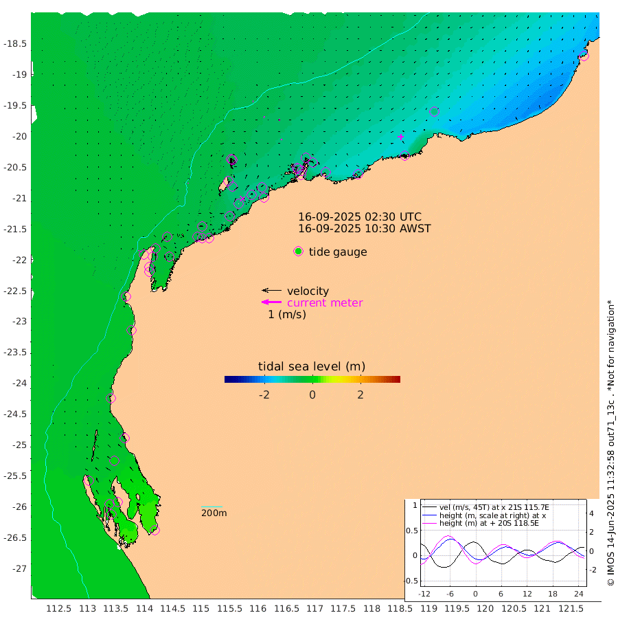 2cm/s 146T +12cm/s rms + 5cm/s -173T. NWSBAR 206m 3cm/s -132T +22cm/s rms + 10cm/s -148T. TAN100 109m 2cm/s -79T +11cm/s rms + 8cm/s -129T. PIL200 208m 3cm/s -84T +13cm/s rms + 7cm/s -137T. PIL100 105m 4cm/s -93T +12cm/s rms + 2cm/s -92T. PIL050 55m 4cm/s -136T +18cm/s rms + 4cm/s -149T. NRSNIN 61m 5cm/s -75T +6cm/s rms + 3cm/s 112T. NW Shelf M6 65m -18cm Withnell Point 2cm Denham 6cm Shark Bay (Inr Bn) 0cm Shark Bay 18cm Useless Loop 23cm Hamelin Pool -38cm Carnarvon -34cm Cape Cuvier -35cm Coral Bay -39cm Norwegian Bay -61cm Badjirrajirra -37cm Tantabiddi -48cm Point Murat -54cm Exmouth -59cm Learmonth -52cm Y Island -42cm North Muiron Island -48cm Roller -51cm Ashburton North -54cm Onslow (Beadon Creek) -52cm Thevenard Island -77cm Large Island -86cm North Sandy Island -67cm Barrow Island (Wapet Landing) -82cm Barrow Island (Tanker Mooring) -83cm Withnell Bay -66cm Trimouille Island -51cm North West Island -84cm Fortescue Road -79cm Steamboat Island -94cm Sholl Island -83cm Fairway Beacon -84cm Mawby Island -85cm Dampier (King Bay) -90cm Cape Legendre -91cm Hauy Island -100cm Port Walcott (Cape Lambert) -91cm Depuch Island -117cm Port Hedland -101cm Bedout Island -145cm Lagrange Bay