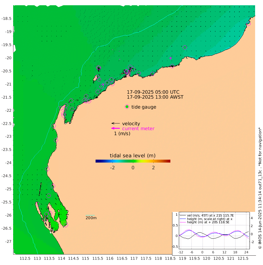 1cm/s 160T +12cm/s rms + 5cm/s -173T. NWSBAR 206m 3cm/s -134T +22cm/s rms + 10cm/s -148T. TAN100 109m 0cm/s -33T +11cm/s rms + 8cm/s -129T. PIL200 208m 2cm/s -96T +13cm/s rms + 7cm/s -137T. PIL100 105m 3cm/s -98T +12cm/s rms + 2cm/s -92T. PIL050 55m 4cm/s -142T +18cm/s rms + 4cm/s -149T. NRSNIN 61m 2cm/s 175T +6cm/s rms + 3cm/s 112T. NW Shelf M6 65m -27cm Withnell Point -14cm Denham -10cm Shark Bay (Inr Bn) -17cm Shark Bay -1cm Useless Loop 20cm Hamelin Pool -42cm Carnarvon -35cm Cape Cuvier -34cm Coral Bay -37cm Norwegian Bay -49cm Badjirrajirra -35cm Tantabiddi -42cm Point Murat -45cm Exmouth -45cm Learmonth -42cm Y Island -36cm North Muiron Island -38cm Roller -43cm Ashburton North -44cm Onslow (Beadon Creek) -44cm Thevenard Island -65cm Large Island -59cm North Sandy Island -52cm Barrow Island (Wapet Landing) -59cm Barrow Island (Tanker Mooring) -59cm Withnell Bay -47cm Trimouille Island -41cm North West Island -73cm Fortescue Road -52cm Steamboat Island -52cm Sholl Island -58cm Fairway Beacon -58cm Mawby Island -60cm Dampier (King Bay) -70cm Cape Legendre -62cm Hauy Island -66cm Port Walcott (Cape Lambert) -59cm Depuch Island -72cm Port Hedland -61cm Bedout Island -109cm Lagrange Bay