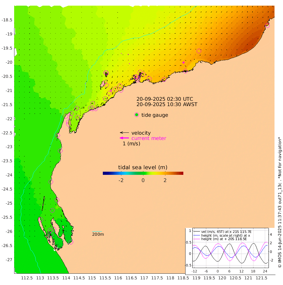 3cm/s -42T +12cm/s rms + 5cm/s -173T. NWSBAR 206m 0cm/s 40T +22cm/s rms + 10cm/s -148T. TAN100 109m 1cm/s 84T +11cm/s rms + 8cm/s -129T. PIL200 208m 3cm/s 70T +13cm/s rms + 7cm/s -137T. PIL100 105m 5cm/s 72T +12cm/s rms + 2cm/s -92T. PIL050 55m 0cm/s -7T +18cm/s rms + 4cm/s -149T. NRSNIN 61m 6cm/s -24T +6cm/s rms + 3cm/s 112T. NW Shelf M6 65m 28cm Withnell Point 25cm Denham 24cm Shark Bay (Inr Bn) 26cm Shark Bay 19cm Useless Loop -7cm Hamelin Pool 38cm Carnarvon 27cm Cape Cuvier 29cm Coral Bay 29cm Norwegian Bay 74cm Badjirrajirra 36cm Tantabiddi 55cm Point Murat 65cm Exmouth 78cm Learmonth 60cm Y Island 46cm North Muiron Island 54cm Roller 61cm Ashburton North 67cm Onslow (Beadon Creek) 64cm Thevenard Island 78cm Large Island 116cm North Sandy Island 90cm Barrow Island (Wapet Landing) 115cm Barrow Island (Tanker Mooring) 127cm Withnell Bay 86cm Trimouille Island 75cm North West Island 90cm Fortescue Road 117cm Steamboat Island 113cm Sholl Island 124cm Fairway Beacon 126cm Mawby Island 128cm Dampier (King Bay) 131cm Cape Legendre 137cm Hauy Island 159cm Port Walcott (Cape Lambert) 173cm Depuch Island 195cm Port Hedland 186cm Bedout Island 193cm Lagrange Bay