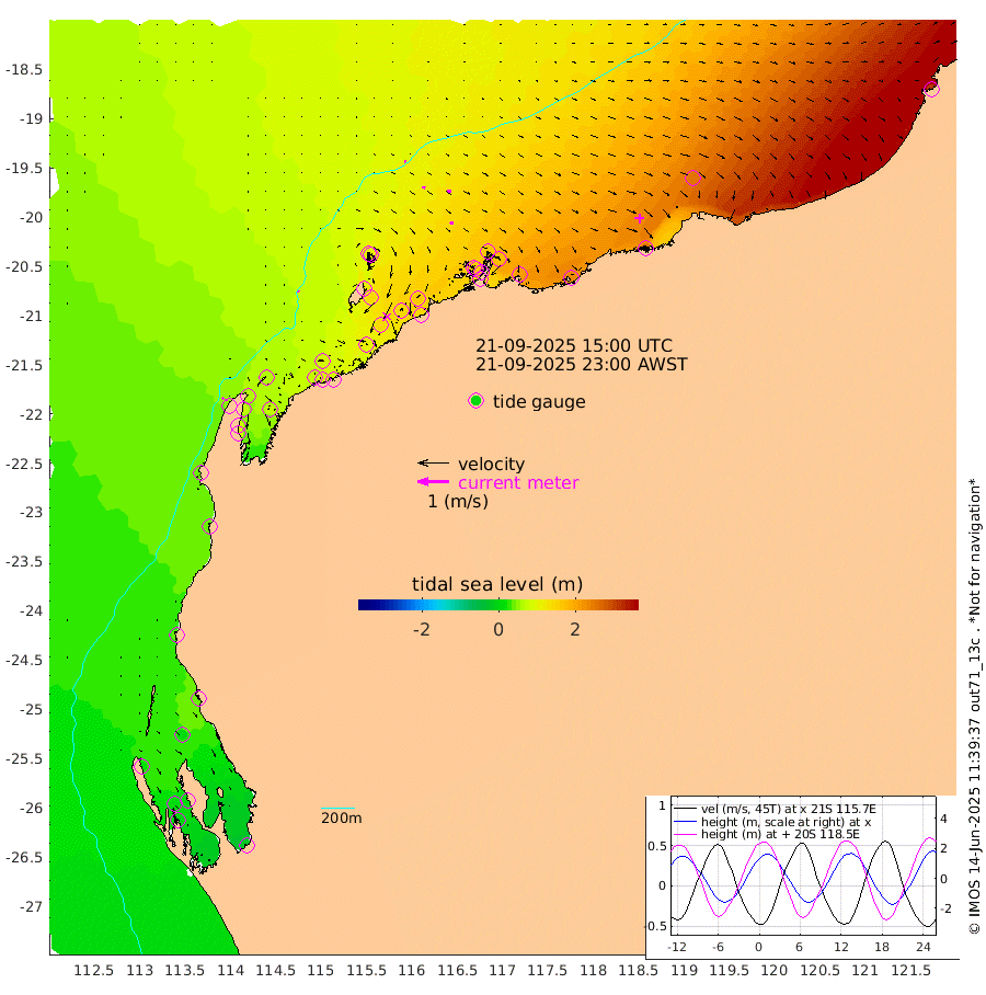 4cm/s -38T +12cm/s rms + 5cm/s -173T. NWSBAR 206m 5cm/s 43T +22cm/s rms + 10cm/s -148T. TAN100 109m 4cm/s 110T +11cm/s rms + 8cm/s -129T. PIL200 208m 9cm/s 107T +13cm/s rms + 7cm/s -137T. PIL100 105m 11cm/s 103T +12cm/s rms + 2cm/s -92T. PIL050 55m 5cm/s 44T +18cm/s rms + 4cm/s -149T. NRSNIN 61m 12cm/s 93T +6cm/s rms + 3cm/s 112T. NW Shelf M6 65m 22cm Withnell Point 9cm Denham 6cm Shark Bay (Inr Bn) 8cm Shark Bay -4cm Useless Loop -16cm Hamelin Pool 43cm Carnarvon 35cm Cape Cuvier 38cm Coral Bay 40cm Norwegian Bay 89cm Badjirrajirra 46cm Tantabiddi 67cm Point Murat 79cm Exmouth 93cm Learmonth 76cm Y Island 59cm North Muiron Island 69cm Roller 79cm Ashburton North 85cm Onslow (Beadon Creek) 81cm Thevenard Island 111cm Large Island 145cm North Sandy Island 114cm Barrow Island (Wapet Landing) 139cm Barrow Island (Tanker Mooring) 165cm Withnell Bay 108cm Trimouille Island 93cm North West Island 137cm Fortescue Road 158cm Steamboat Island 143cm Sholl Island 162cm Fairway Beacon 163cm Mawby Island 165cm Dampier (King Bay) 169cm Cape Legendre 176cm Hauy Island 205cm Port Walcott (Cape Lambert) 228cm Depuch Island 255cm Port Hedland 248cm Bedout Island 310cm Lagrange Bay