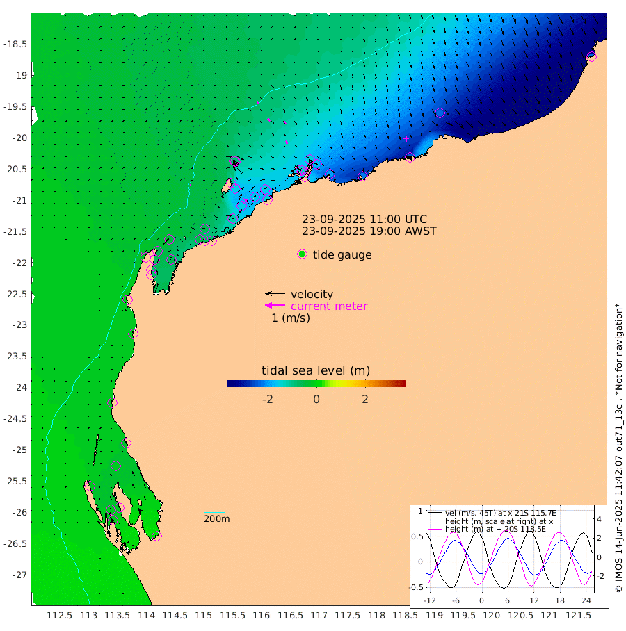 7cm/s 93T +12cm/s rms + 5cm/s -173T. NWSBAR 206m 4cm/s 37T +22cm/s rms + 10cm/s -148T. TAN100 109m 8cm/s 107T +11cm/s rms + 8cm/s -129T. PIL200 208m 14cm/s 137T +13cm/s rms + 7cm/s -137T. PIL100 105m 16cm/s 143T +12cm/s rms + 2cm/s -92T. PIL050 55m 5cm/s 55T +18cm/s rms + 4cm/s -149T. NRSNIN 61m 17cm/s 146T +6cm/s rms + 3cm/s 112T. NW Shelf M6 65m -17cm Withnell Point -20cm Denham -16cm Shark Bay (Inr Bn) -19cm Shark Bay -13cm Useless Loop 8cm Hamelin Pool -31cm Carnarvon -15cm Cape Cuvier -17cm Coral Bay -19cm Norwegian Bay -90cm Badjirrajirra -27cm Tantabiddi -59cm Point Murat -76cm Exmouth -89cm Learmonth -66cm Y Island -43cm North Muiron Island -53cm Roller -62cm Ashburton North -71cm Onslow (Beadon Creek) -64cm Thevenard Island -118cm Large Island -155cm North Sandy Island -105cm Barrow Island (Wapet Landing) -154cm Barrow Island (Tanker Mooring) -147cm Withnell Bay -99cm Trimouille Island -80cm North West Island -140cm Fortescue Road -151cm Steamboat Island -162cm Sholl Island -145cm Fairway Beacon -145cm Mawby Island -148cm Dampier (King Bay) -141cm Cape Legendre -174cm Hauy Island -195cm Port Walcott (Cape Lambert) -217cm Depuch Island -244cm Port Hedland -231cm Bedout Island -230cm Lagrange Bay
