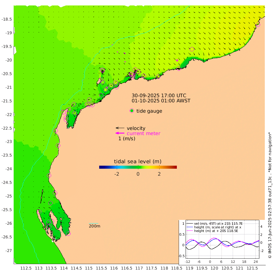 2cm/s 73T +12cm/s rms + 5cm/s -173T. NWSBAR 206m 5cm/s 38T +22cm/s rms + 10cm/s -148T. TAN100 109m 6cm/s 109T +11cm/s rms + 8cm/s -129T. PIL200 208m 10cm/s 123T +13cm/s rms + 7cm/s -137T. PIL100 105m 12cm/s 126T +12cm/s rms + 2cm/s -92T. PIL050 55m 5cm/s 44T +18cm/s rms + 4cm/s -149T. NRSNIN 61m 19cm/s 121T +6cm/s rms + 3cm/s 112T. NW Shelf M6 65m 25cm Withnell Point 17cm Denham 16cm Shark Bay (Inr Bn) 20cm Shark Bay 12cm Useless Loop -8cm Hamelin Pool 35cm Carnarvon 36cm Cape Cuvier 37cm Coral Bay 35cm Norwegian Bay 44cm Badjirrajirra 39cm Tantabiddi 41cm Point Murat 42cm Exmouth 41cm Learmonth 45cm Y Island 42cm North Muiron Island 46cm Roller 46cm Ashburton North 47cm Onslow (Beadon Creek) 47cm Thevenard Island 22cm Large Island 57cm North Sandy Island 52cm Barrow Island (Wapet Landing) 53cm Barrow Island (Tanker Mooring) 69cm Withnell Bay 52cm Trimouille Island 53cm North West Island 10cm Fortescue Road 83cm Steamboat Island 60cm Sholl Island 67cm Fairway Beacon 70cm Mawby Island 69cm Dampier (King Bay) 69cm Cape Legendre 67cm Hauy Island 77cm Port Walcott (Cape Lambert) 85cm Depuch Island 90cm Port Hedland 97cm Bedout Island 51cm Lagrange Bay