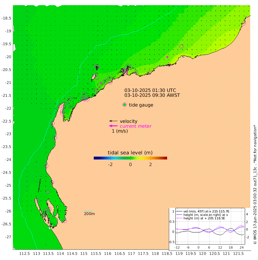 1cm/s -99T +12cm/s rms + 5cm/s -173T. NWSBAR 206m 3cm/s -139T +22cm/s rms + 10cm/s -148T. TAN100 109m 2cm/s -69T +11cm/s rms + 8cm/s -129T. PIL200 208m 4cm/s -41T +13cm/s rms + 7cm/s -137T. PIL100 105m 4cm/s -23T +12cm/s rms + 2cm/s -92T. PIL050 55m 3cm/s -131T +18cm/s rms + 4cm/s -149T. NRSNIN 61m 10cm/s -51T +6cm/s rms + 3cm/s 112T. NW Shelf M6 65m 10cm Withnell Point 21cm Denham 21cm Shark Bay (Inr Bn) 21cm Shark Bay 24cm Useless Loop 5cm Hamelin Pool 6cm Carnarvon -1cm Cape Cuvier 0cm Coral Bay -1cm Norwegian Bay 12cm Badjirrajirra 3cm Tantabiddi 8cm Point Murat 11cm Exmouth 15cm Learmonth 9cm Y Island 6cm North Muiron Island 7cm Roller 9cm Ashburton North 10cm Onslow (Beadon Creek) 10cm Thevenard Island 32cm Large Island 24cm North Sandy Island 17cm Barrow Island (Wapet Landing) 25cm Barrow Island (Tanker Mooring) 25cm Withnell Bay 16cm Trimouille Island 16cm North West Island 38cm Fortescue Road 19cm Steamboat Island 14cm Sholl Island 23cm Fairway Beacon 22cm Mawby Island 25cm Dampier (King Bay) 21cm Cape Legendre 30cm Hauy Island 34cm Port Walcott (Cape Lambert) 50cm Depuch Island 43cm Port Hedland 42cm Bedout Island 73cm Lagrange Bay