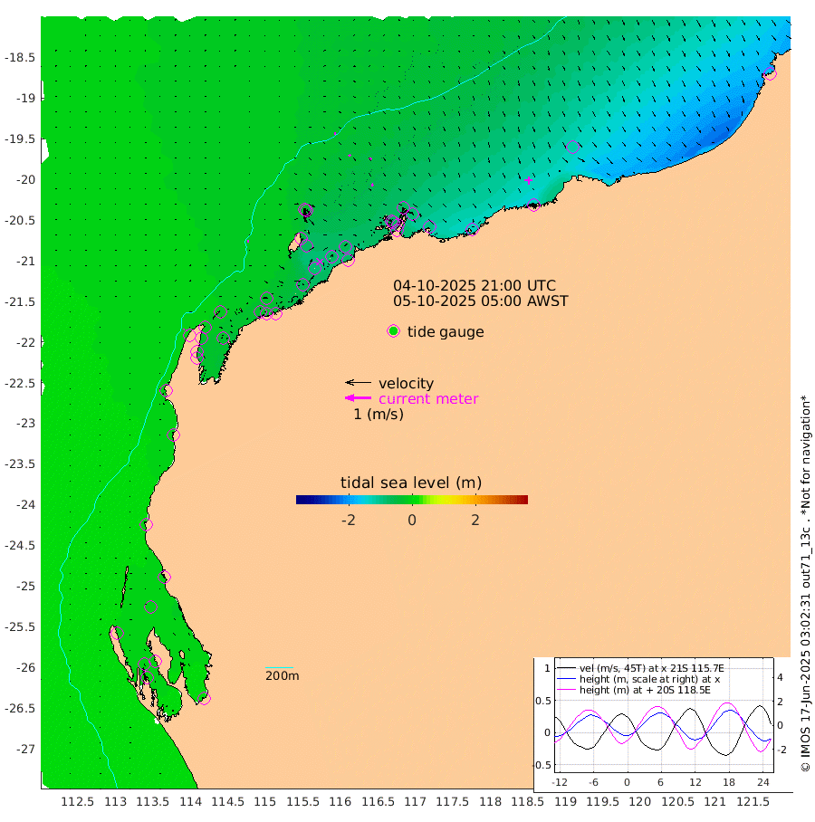 6cm/s 89T +12cm/s rms + 5cm/s -173T. NWSBAR 206m 2cm/s 41T +22cm/s rms + 10cm/s -148T. TAN100 109m 5cm/s 109T +11cm/s rms + 8cm/s -129T. PIL200 208m 7cm/s 138T +13cm/s rms + 7cm/s -137T. PIL100 105m 9cm/s 150T +12cm/s rms + 2cm/s -92T. PIL050 55m 2cm/s 46T +18cm/s rms + 4cm/s -149T. NRSNIN 61m 8cm/s 131T +6cm/s rms + 3cm/s 112T. NW Shelf M6 65m -7cm Withnell Point -5cm Denham -6cm Shark Bay (Inr Bn) -3cm Shark Bay 1cm Useless Loop 5cm Hamelin Pool -10cm Carnarvon 0cm Cape Cuvier -2cm Coral Bay -3cm Norwegian Bay -36cm Badjirrajirra -7cm Tantabiddi -22cm Point Murat -31cm Exmouth -44cm Learmonth -26cm Y Island -16cm North Muiron Island -24cm Roller -25cm Ashburton North -30cm Onslow (Beadon Creek) -27cm Thevenard Island -66cm Large Island -79cm North Sandy Island -48cm Barrow Island (Wapet Landing) -75cm Barrow Island (Tanker Mooring) -73cm Withnell Bay -57cm Trimouille Island -33cm North West Island -78cm Fortescue Road -66cm Steamboat Island -70cm Sholl Island -72cm Fairway Beacon -69cm Mawby Island -73cm Dampier (King Bay) -68cm Cape Legendre -86cm Hauy Island -98cm Port Walcott (Cape Lambert) -129cm Depuch Island -126cm Port Hedland -113cm Bedout Island -164cm Lagrange Bay