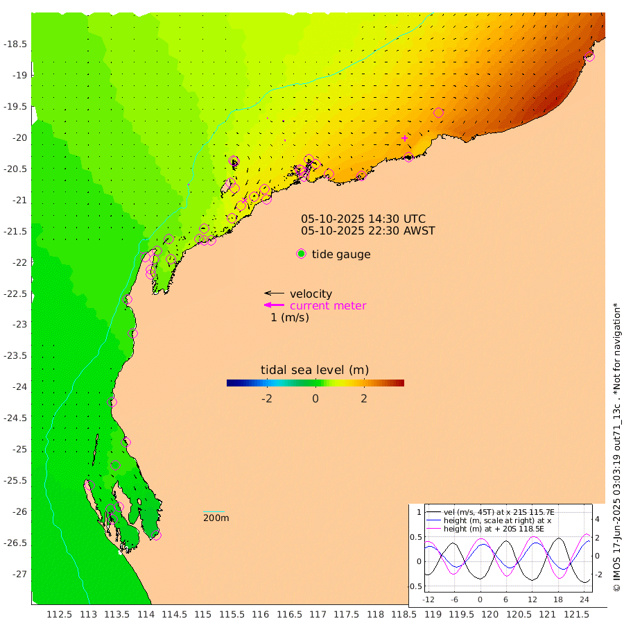 5cm/s -68T +12cm/s rms + 5cm/s -173T. NWSBAR 206m 2cm/s 40T +22cm/s rms + 10cm/s -148T. TAN100 109m 0cm/s -109T +11cm/s rms + 8cm/s -129T. PIL200 208m 2cm/s 71T +13cm/s rms + 7cm/s -137T. PIL100 105m 4cm/s 58T +12cm/s rms + 2cm/s -92T. PIL050 55m 3cm/s 41T +18cm/s rms + 4cm/s -149T. NRSNIN 61m 5cm/s 71T +6cm/s rms + 3cm/s 112T. NW Shelf M6 65m 19cm Withnell Point 10cm Denham 8cm Shark Bay (Inr Bn) 10cm Shark Bay -2cm Useless Loop -13cm Hamelin Pool 33cm Carnarvon 22cm Cape Cuvier 25cm Coral Bay 27cm Norwegian Bay 68cm Badjirrajirra 32cm Tantabiddi 50cm Point Murat 61cm Exmouth 71cm Learmonth 59cm Y Island 44cm North Muiron Island 55cm Roller 59cm Ashburton North 64cm Onslow (Beadon Creek) 61cm Thevenard Island 97cm Large Island 123cm North Sandy Island 88cm Barrow Island (Wapet Landing) 115cm Barrow Island (Tanker Mooring) 129cm Withnell Bay 86cm Trimouille Island 67cm North West Island 121cm Fortescue Road 119cm Steamboat Island 111cm Sholl Island 126cm Fairway Beacon 126cm Mawby Island 128cm Dampier (King Bay) 128cm Cape Legendre 140cm Hauy Island 162cm Port Walcott (Cape Lambert) 192cm Depuch Island 202cm Port Hedland 198cm Bedout Island 276cm Lagrange Bay