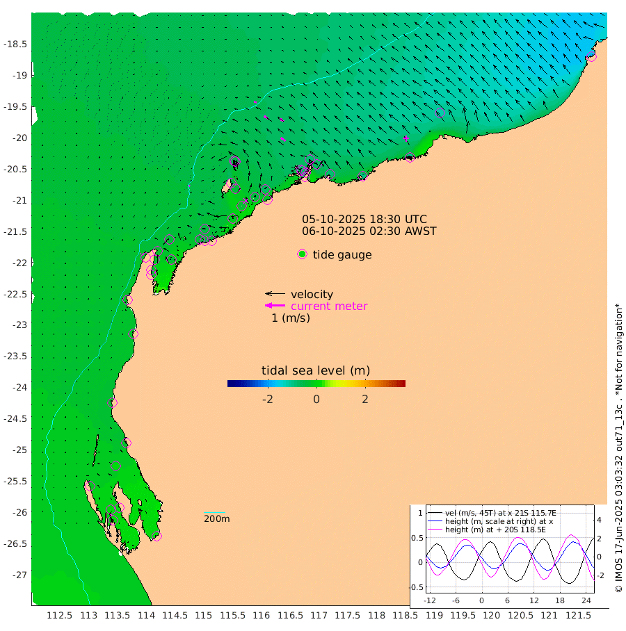 7cm/s -148T +12cm/s rms + 5cm/s -173T. NWSBAR 206m 7cm/s -137T +22cm/s rms + 10cm/s -148T. TAN100 109m 14cm/s -76T +11cm/s rms + 8cm/s -129T. PIL200 208m 23cm/s -57T +13cm/s rms + 7cm/s -137T. PIL100 105m 28cm/s -56T +12cm/s rms + 2cm/s -92T. PIL050 55m 7cm/s -131T +18cm/s rms + 4cm/s -149T. NRSNIN 61m 22cm/s -59T +6cm/s rms + 3cm/s 112T. NW Shelf M6 65m -11cm Withnell Point 6cm Denham 4cm Shark Bay (Inr Bn) 5cm Shark Bay 10cm Useless Loop 8cm Hamelin Pool -24cm Carnarvon -27cm Cape Cuvier -29cm Coral Bay -32cm Norwegian Bay -35cm Badjirrajirra -33cm Tantabiddi -31cm Point Murat -33cm Exmouth -37cm Learmonth -40cm Y Island -37cm North Muiron Island -42cm Roller -44cm Ashburton North -44cm Onslow (Beadon Creek) -46cm Thevenard Island -20cm Large Island -43cm North Sandy Island -52cm Barrow Island (Wapet Landing) -42cm Barrow Island (Tanker Mooring) -82cm Withnell Bay -51cm Trimouille Island -46cm North West Island -33cm Fortescue Road -71cm Steamboat Island -48cm Sholl Island -77cm Fairway Beacon -80cm Mawby Island -80cm Dampier (King Bay) -90cm Cape Legendre -75cm Hauy Island -89cm Port Walcott (Cape Lambert) -100cm Depuch Island -111cm Port Hedland -115cm Bedout Island -184cm Lagrange Bay