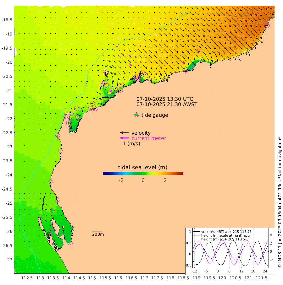 7cm/s 45T +12cm/s rms + 5cm/s -173T. NWSBAR 206m 11cm/s 42T +22cm/s rms + 10cm/s -148T. TAN100 109m 17cm/s 109T +11cm/s rms + 8cm/s -129T. PIL200 208m 30cm/s 123T +13cm/s rms + 7cm/s -137T. PIL100 105m 36cm/s 124T +12cm/s rms + 2cm/s -92T. PIL050 55m 11cm/s 47T +18cm/s rms + 4cm/s -149T. NRSNIN 61m 35cm/s 121T +6cm/s rms + 3cm/s 112T. NW Shelf M6 65m 25cm Withnell Point 5cm Denham 6cm Shark Bay (Inr Bn) 7cm Shark Bay -2cm Useless Loop -11cm Hamelin Pool 44cm Carnarvon 47cm Cape Cuvier 51cm Coral Bay 52cm Norwegian Bay 65cm Badjirrajirra 56cm Tantabiddi 58cm Point Murat 61cm Exmouth 65cm Learmonth 70cm Y Island 62cm North Muiron Island 71cm Roller 75cm Ashburton North 76cm Onslow (Beadon Creek) 77cm Thevenard Island 50cm Large Island 88cm North Sandy Island 90cm Barrow Island (Wapet Landing) 83cm Barrow Island (Tanker Mooring) 136cm Withnell Bay 88cm Trimouille Island 79cm North West Island 67cm Fortescue Road 124cm Steamboat Island 90cm Sholl Island 130cm Fairway Beacon 132cm Mawby Island 134cm Dampier (King Bay) 145cm Cape Legendre 126cm Hauy Island 152cm Port Walcott (Cape Lambert) 165cm Depuch Island 188cm Port Hedland 204cm Bedout Island 267cm Lagrange Bay