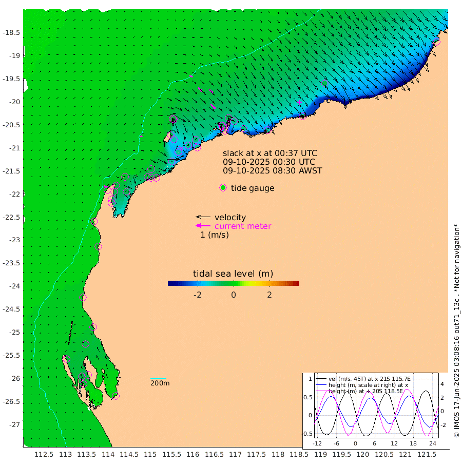 15cm/s 71T +12cm/s rms + 5cm/s -173T. NWSBAR 206m 10cm/s 44T +22cm/s rms + 10cm/s -148T. TAN100 109m 22cm/s 111T +11cm/s rms + 8cm/s -129T. PIL200 208m 37cm/s 131T +13cm/s rms + 7cm/s -137T. PIL100 105m 44cm/s 134T +12cm/s rms + 2cm/s -92T. PIL050 55m 10cm/s 50T +18cm/s rms + 4cm/s -149T. NRSNIN 61m 35cm/s 136T +6cm/s rms + 3cm/s 112T. NW Shelf M6 65m -40cm Withnell Point -50cm Denham -45cm Shark Bay (Inr Bn) -46cm Shark Bay -37cm Useless Loop 11cm Hamelin Pool -40cm Carnarvon -14cm Cape Cuvier -13cm Coral Bay -16cm Norwegian Bay -70cm Badjirrajirra -17cm Tantabiddi -46cm Point Murat -62cm Exmouth -71cm Learmonth -46cm Y Island -29cm North Muiron Island -35cm Roller -34cm Ashburton North -44cm Onslow (Beadon Creek) -36cm Thevenard Island -113cm Large Island -111cm North Sandy Island -63cm Barrow Island (Wapet Landing) -115cm Barrow Island (Tanker Mooring) -66cm Withnell Bay -68cm Trimouille Island -44cm North West Island -111cm Fortescue Road -79cm Steamboat Island -94cm Sholl Island -69cm Fairway Beacon -65cm Mawby Island -66cm Dampier (King Bay) -63cm Cape Legendre -93cm Hauy Island -93cm Port Walcott (Cape Lambert) -118cm Depuch Island -107cm Port Hedland -62cm Bedout Island -87cm Lagrange Bay