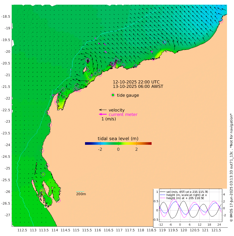 8cm/s -131T +12cm/s rms + 5cm/s -173T. NWSBAR 206m 12cm/s -138T +22cm/s rms + 10cm/s -148T. TAN100 109m 17cm/s -74T +11cm/s rms + 8cm/s -129T. PIL200 208m 30cm/s -53T +13cm/s rms + 7cm/s -137T. PIL100 105m 35cm/s -51T +12cm/s rms + 2cm/s -92T. PIL050 55m 12cm/s -131T +18cm/s rms + 4cm/s -149T. NRSNIN 61m 40cm/s -51T +6cm/s rms + 3cm/s 112T. NW Shelf M6 65m 6cm Withnell Point 37cm Denham 36cm Shark Bay (Inr Bn) 33cm Shark Bay 46cm Useless Loop 16cm Hamelin Pool -14cm Carnarvon -28cm Cape Cuvier -31cm Coral Bay -29cm Norwegian Bay -25cm Badjirrajirra -33cm Tantabiddi -27cm Point Murat -24cm Exmouth -29cm Learmonth -34cm Y Island -34cm North Muiron Island -42cm Roller -42cm Ashburton North -40cm Onslow (Beadon Creek) -43cm Thevenard Island -16cm Large Island -46cm North Sandy Island -46cm Barrow Island (Wapet Landing) -34cm Barrow Island (Tanker Mooring) -78cm Withnell Bay -50cm Trimouille Island -44cm North West Island -20cm Fortescue Road -70cm Steamboat Island -57cm Sholl Island -75cm Fairway Beacon -78cm Mawby Island -78cm Dampier (King Bay) -76cm Cape Legendre -67cm Hauy Island -87cm Port Walcott (Cape Lambert) -90cm Depuch Island -110cm Port Hedland -126cm Bedout Island -173cm Lagrange Bay