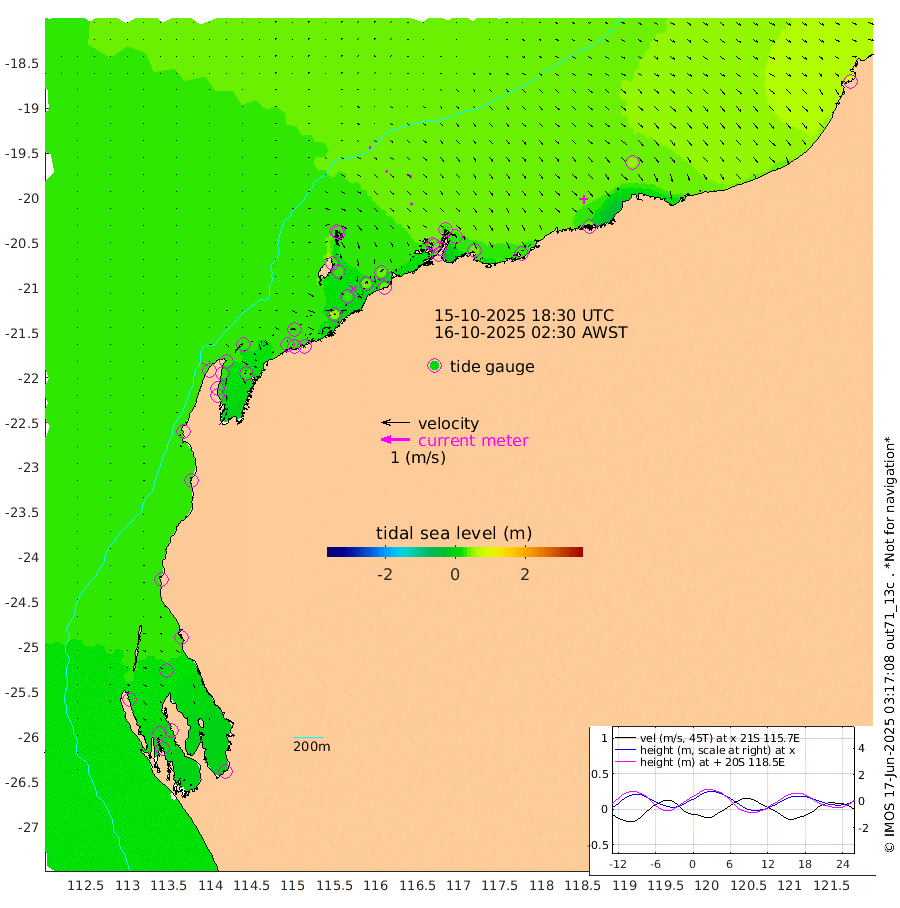 2cm/s 77T +12cm/s rms + 5cm/s -173T. NWSBAR 206m 3cm/s 38T +22cm/s rms + 10cm/s -148T. TAN100 109m 5cm/s 107T +11cm/s rms + 8cm/s -129T. PIL200 208m 6cm/s 126T +13cm/s rms + 7cm/s -137T. PIL100 105m 8cm/s 133T +12cm/s rms + 2cm/s -92T. PIL050 55m 3cm/s 44T +18cm/s rms + 4cm/s -149T. NRSNIN 61m 14cm/s 121T +6cm/s rms + 3cm/s 112T. NW Shelf M6 65m 17cm Withnell Point 13cm Denham 12cm Shark Bay (Inr Bn) 17cm Shark Bay 12cm Useless Loop -3cm Hamelin Pool 23cm Carnarvon 26cm Cape Cuvier 28cm Coral Bay 26cm Norwegian Bay 28cm Badjirrajirra 27cm Tantabiddi 27cm Point Murat 27cm Exmouth 25cm Learmonth 32cm Y Island 29cm North Muiron Island 31cm Roller 30cm Ashburton North 29cm Onslow (Beadon Creek) 31cm Thevenard Island 48cm Large Island 33cm North Sandy Island 31cm Barrow Island (Wapet Landing) 30cm Barrow Island (Tanker Mooring) 35cm Withnell Bay 26cm Trimouille Island 30cm North West Island 45cm Fortescue Road 34cm Steamboat Island 36cm Sholl Island 34cm Fairway Beacon 36cm Mawby Island 36cm Dampier (King Bay) 30cm Cape Legendre 30cm Hauy Island 37cm Port Walcott (Cape Lambert) 27cm Depuch Island 41cm Port Hedland 50cm Bedout Island 97cm Lagrange Bay