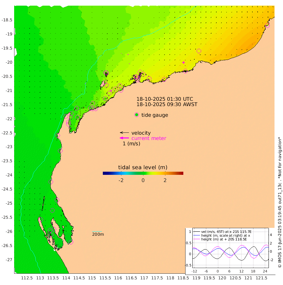 3cm/s -50T +12cm/s rms + 5cm/s -173T. NWSBAR 206m 1cm/s -156T +22cm/s rms + 10cm/s -148T. TAN100 109m 1cm/s 20T +11cm/s rms + 8cm/s -129T. PIL200 208m 2cm/s 39T +13cm/s rms + 7cm/s -137T. PIL100 105m 3cm/s 52T +12cm/s rms + 2cm/s -92T. PIL050 55m 1cm/s -122T +18cm/s rms + 4cm/s -149T. NRSNIN 61m 7cm/s -47T +6cm/s rms + 3cm/s 112T. NW Shelf M6 65m 14cm Withnell Point 13cm Denham 13cm Shark Bay (Inr Bn) 13cm Shark Bay 9cm Useless Loop -5cm Hamelin Pool 21cm Carnarvon 13cm Cape Cuvier 14cm Coral Bay 14cm Norwegian Bay 44cm Badjirrajirra 19cm Tantabiddi 31cm Point Murat 38cm Exmouth 50cm Learmonth 33cm Y Island 24cm North Muiron Island 30cm Roller 36cm Ashburton North 39cm Onslow (Beadon Creek) 38cm Thevenard Island 38cm Large Island 73cm North Sandy Island 56cm Barrow Island (Wapet Landing) 72cm Barrow Island (Tanker Mooring) 80cm Withnell Bay 54cm Trimouille Island 45cm North West Island 45cm Fortescue Road 71cm Steamboat Island 73cm Sholl Island 78cm Fairway Beacon 80cm Mawby Island 81cm Dampier (King Bay) 85cm Cape Legendre 89cm Hauy Island 102cm Port Walcott (Cape Lambert) 111cm Depuch Island 126cm Port Hedland 116cm Bedout Island 95cm Lagrange Bay