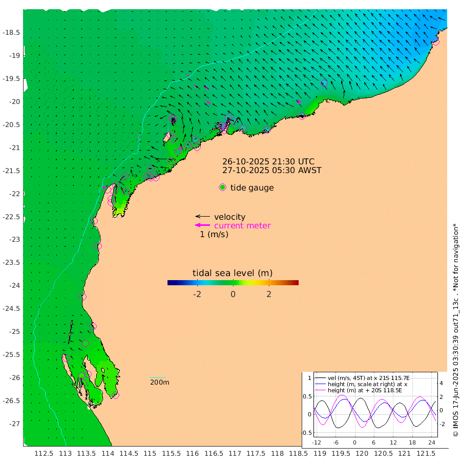 6cm/s -142T +12cm/s rms + 5cm/s -173T. NWSBAR 206m 11cm/s -139T +22cm/s rms + 10cm/s -148T. TAN100 109m 15cm/s -75T +11cm/s rms + 8cm/s -129T. PIL200 208m 26cm/s -55T +13cm/s rms + 7cm/s -137T. PIL100 105m 30cm/s -53T +12cm/s rms + 2cm/s -92T. PIL050 55m 11cm/s -133T +18cm/s rms + 4cm/s -149T. NRSNIN 61m 39cm/s -57T +6cm/s rms + 3cm/s 112T. NW Shelf M6 65m -7cm Withnell Point 22cm Denham 23cm Shark Bay (Inr Bn) 20cm Shark Bay 33cm Useless Loop 17cm Hamelin Pool -27cm Carnarvon -35cm Cape Cuvier -37cm Coral Bay -37cm Norwegian Bay -41cm Badjirrajirra -41cm Tantabiddi -39cm Point Murat -38cm Exmouth -42cm Learmonth -47cm Y Island -44cm North Muiron Island -54cm Roller -52cm Ashburton North -52cm Onslow (Beadon Creek) -53cm Thevenard Island -14cm Large Island -64cm North Sandy Island -60cm Barrow Island (Wapet Landing) -54cm Barrow Island (Tanker Mooring) -95cm Withnell Bay -60cm Trimouille Island -58cm North West Island -20cm Fortescue Road -100cm Steamboat Island -68cm Sholl Island -92cm Fairway Beacon -97cm Mawby Island -94cm Dampier (King Bay) -97cm Cape Legendre -91cm Hauy Island -106cm Port Walcott (Cape Lambert) -125cm Depuch Island -132cm Port Hedland -139cm Bedout Island -188cm Lagrange Bay