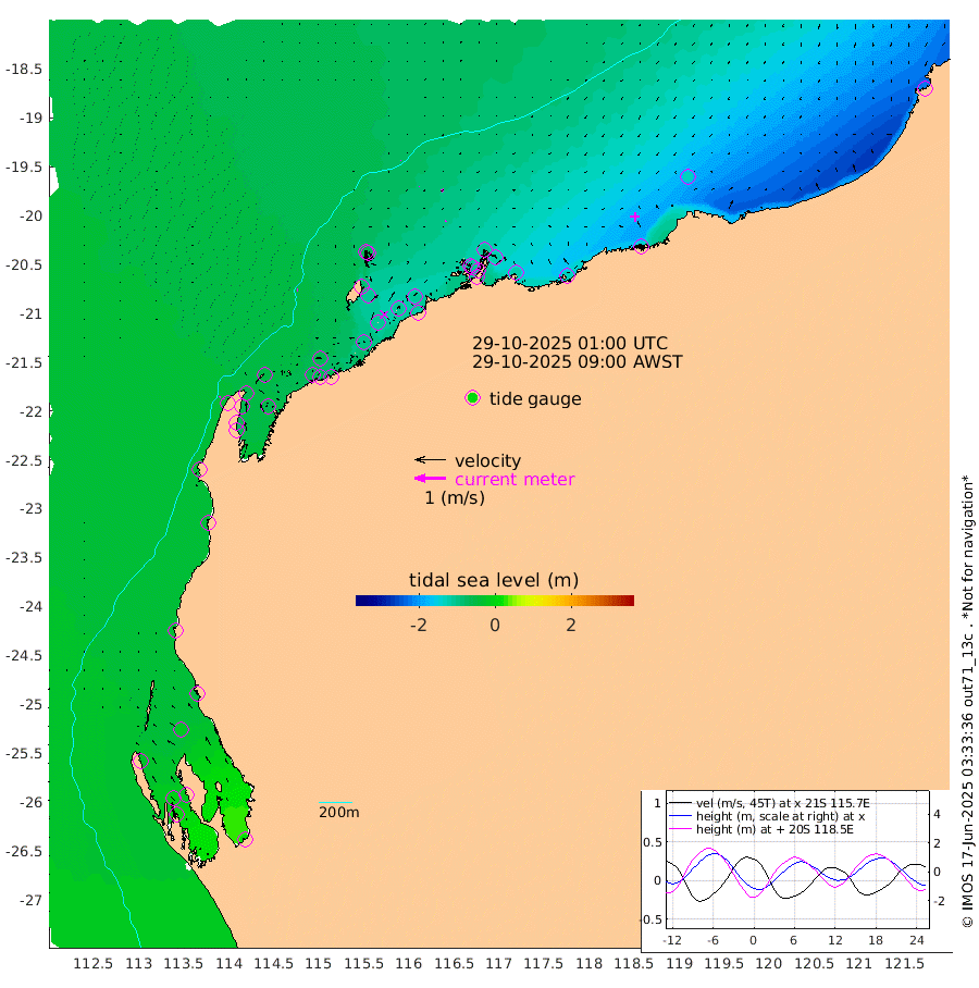 3cm/s 113T +12cm/s rms + 5cm/s -173T. NWSBAR 206m 3cm/s -142T +22cm/s rms + 10cm/s -148T. TAN100 109m 1cm/s -73T +11cm/s rms + 8cm/s -129T. PIL200 208m 1cm/s -143T +13cm/s rms + 7cm/s -137T. PIL100 105m 3cm/s -144T +12cm/s rms + 2cm/s -92T. PIL050 55m 3cm/s -141T +18cm/s rms + 4cm/s -149T. NRSNIN 61m 9cm/s -108T +6cm/s rms + 3cm/s 112T. NW Shelf M6 65m -29cm Withnell Point -14cm Denham -9cm Shark Bay (Inr Bn) -15cm Shark Bay 2cm Useless Loop 20cm Hamelin Pool -47cm Carnarvon -39cm Cape Cuvier -40cm Coral Bay -43cm Norwegian Bay -74cm Badjirrajirra -43cm Tantabiddi -58cm Point Murat -67cm Exmouth -69cm Learmonth -66cm Y Island -53cm North Muiron Island -60cm Roller -61cm Ashburton North -65cm Onslow (Beadon Creek) -62cm Thevenard Island -100cm Large Island -106cm North Sandy Island -80cm Barrow Island (Wapet Landing) -103cm Barrow Island (Tanker Mooring) -102cm Withnell Bay -73cm Trimouille Island -66cm North West Island -113cm Fortescue Road -109cm Steamboat Island -103cm Sholl Island -103cm Fairway Beacon -104cm Mawby Island -103cm Dampier (King Bay) -104cm Cape Legendre -113cm Hauy Island -123cm Port Walcott (Cape Lambert) -135cm Depuch Island -145cm Port Hedland -130cm Bedout Island -224cm Lagrange Bay