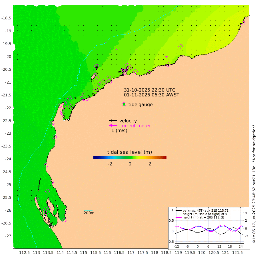 2cm/s 8T +12cm/s rms + 5cm/s -173T. NWSBAR 206m 1cm/s -158T +22cm/s rms + 10cm/s -148T. TAN100 109m 2cm/s 96T +11cm/s rms + 8cm/s -129T. PIL200 208m 2cm/s 107T +13cm/s rms + 7cm/s -137T. PIL100 105m 3cm/s 107T +12cm/s rms + 2cm/s -92T. PIL050 55m 1cm/s -116T +18cm/s rms + 4cm/s -149T. NRSNIN 61m 7cm/s -18T +6cm/s rms + 3cm/s 112T. NW Shelf M6 65m 13cm Withnell Point 14cm Denham 13cm Shark Bay (Inr Bn) 15cm Shark Bay 12cm Useless Loop -4cm Hamelin Pool 18cm Carnarvon 12cm Cape Cuvier 13cm Coral Bay 16cm Norwegian Bay 28cm Badjirrajirra 16cm Tantabiddi 21cm Point Murat 25cm Exmouth 24cm Learmonth 26cm Y Island 20cm North Muiron Island 22cm Roller 23cm Ashburton North 24cm Onslow (Beadon Creek) 24cm Thevenard Island 34cm Large Island 33cm North Sandy Island 31cm Barrow Island (Wapet Landing) 35cm Barrow Island (Tanker Mooring) 41cm Withnell Bay 19cm Trimouille Island 27cm North West Island 44cm Fortescue Road 39cm Steamboat Island 35cm Sholl Island 39cm Fairway Beacon 41cm Mawby Island 41cm Dampier (King Bay) 44cm Cape Legendre 46cm Hauy Island 47cm Port Walcott (Cape Lambert) 52cm Depuch Island 57cm Port Hedland 52cm Bedout Island 85cm Lagrange Bay