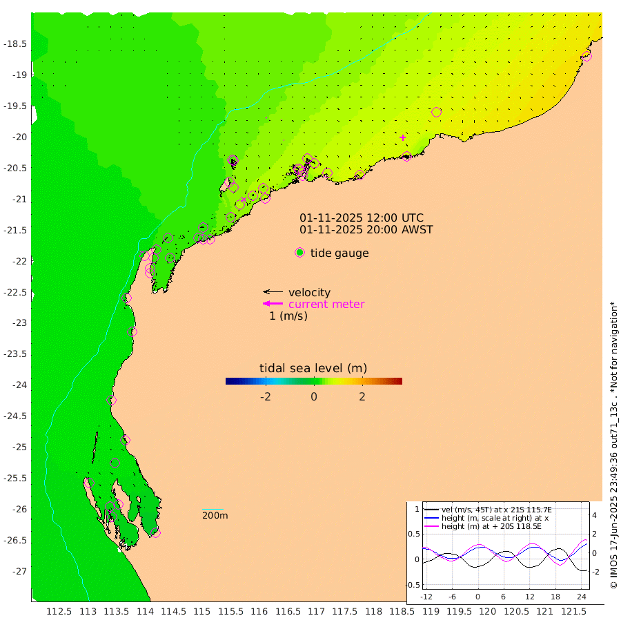 3cm/s -58T +12cm/s rms + 5cm/s -173T. NWSBAR 206m 2cm/s 43T +22cm/s rms + 10cm/s -148T. TAN100 109m 0cm/s -150T +11cm/s rms + 8cm/s -129T. PIL200 208m 3cm/s 111T +13cm/s rms + 7cm/s -137T. PIL100 105m 4cm/s 93T +12cm/s rms + 2cm/s -92T. PIL050 55m 3cm/s 44T +18cm/s rms + 4cm/s -149T. NRSNIN 61m 1cm/s 21T +6cm/s rms + 3cm/s 112T. NW Shelf M6 65m 14cm Withnell Point 5cm Denham 3cm Shark Bay (Inr Bn) 6cm Shark Bay -4cm Useless Loop -12cm Hamelin Pool 23cm Carnarvon 16cm Cape Cuvier 17cm Coral Bay 20cm Norwegian Bay 35cm Badjirrajirra 20cm Tantabiddi 28cm Point Murat 32cm Exmouth 34cm Learmonth 32cm Y Island 25cm North Muiron Island 30cm Roller 32cm Ashburton North 34cm Onslow (Beadon Creek) 33cm Thevenard Island 39cm Large Island 58cm North Sandy Island 44cm Barrow Island (Wapet Landing) 54cm Barrow Island (Tanker Mooring) 63cm Withnell Bay 42cm Trimouille Island 30cm North West Island 57cm Fortescue Road 51cm Steamboat Island 47cm Sholl Island 61cm Fairway Beacon 60cm Mawby Island 61cm Dampier (King Bay) 67cm Cape Legendre 65cm Hauy Island 75cm Port Walcott (Cape Lambert) 89cm Depuch Island 91cm Port Hedland 88cm Bedout Island 128cm Lagrange Bay