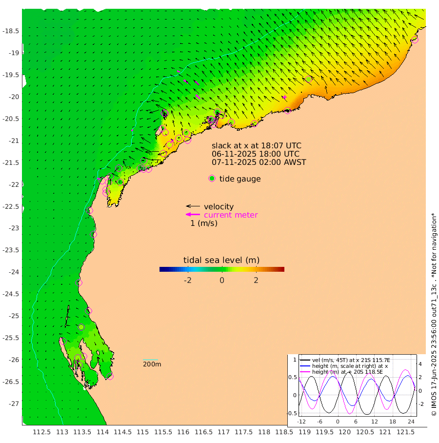 13cm/s -111T +12cm/s rms + 5cm/s -173T. NWSBAR 206m 14cm/s -137T +22cm/s rms + 10cm/s -148T. TAN100 109m 22cm/s -74T +11cm/s rms + 8cm/s -129T. PIL200 208m 38cm/s -51T +13cm/s rms + 7cm/s -137T. PIL100 105m 45cm/s -47T +12cm/s rms + 2cm/s -92T. PIL050 55m 14cm/s -131T +18cm/s rms + 4cm/s -149T. NRSNIN 61m 39cm/s -46T +6cm/s rms + 3cm/s 112T. NW Shelf M6 65m 21cm Withnell Point 49cm Denham 47cm Shark Bay (Inr Bn) 46cm Shark Bay 51cm Useless Loop 10cm Hamelin Pool 9cm Carnarvon -14cm Cape Cuvier -15cm Coral Bay -13cm Norwegian Bay 39cm Badjirrajirra -10cm Tantabiddi 18cm Point Murat 32cm Exmouth 36cm Learmonth 18cm Y Island 2cm North Muiron Island 4cm Roller 5cm Ashburton North 14cm Onslow (Beadon Creek) 6cm Thevenard Island 92cm Large Island 71cm North Sandy Island 30cm Barrow Island (Wapet Landing) 79cm Barrow Island (Tanker Mooring) 30cm Withnell Bay 30cm Trimouille Island 14cm North West Island 100cm Fortescue Road 40cm Steamboat Island 58cm Sholl Island 32cm Fairway Beacon 27cm Mawby Island 30cm Dampier (King Bay) 22cm Cape Legendre 57cm Hauy Island 54cm Port Walcott (Cape Lambert) 74cm Depuch Island 67cm Port Hedland 47cm Bedout Island 73cm Lagrange Bay