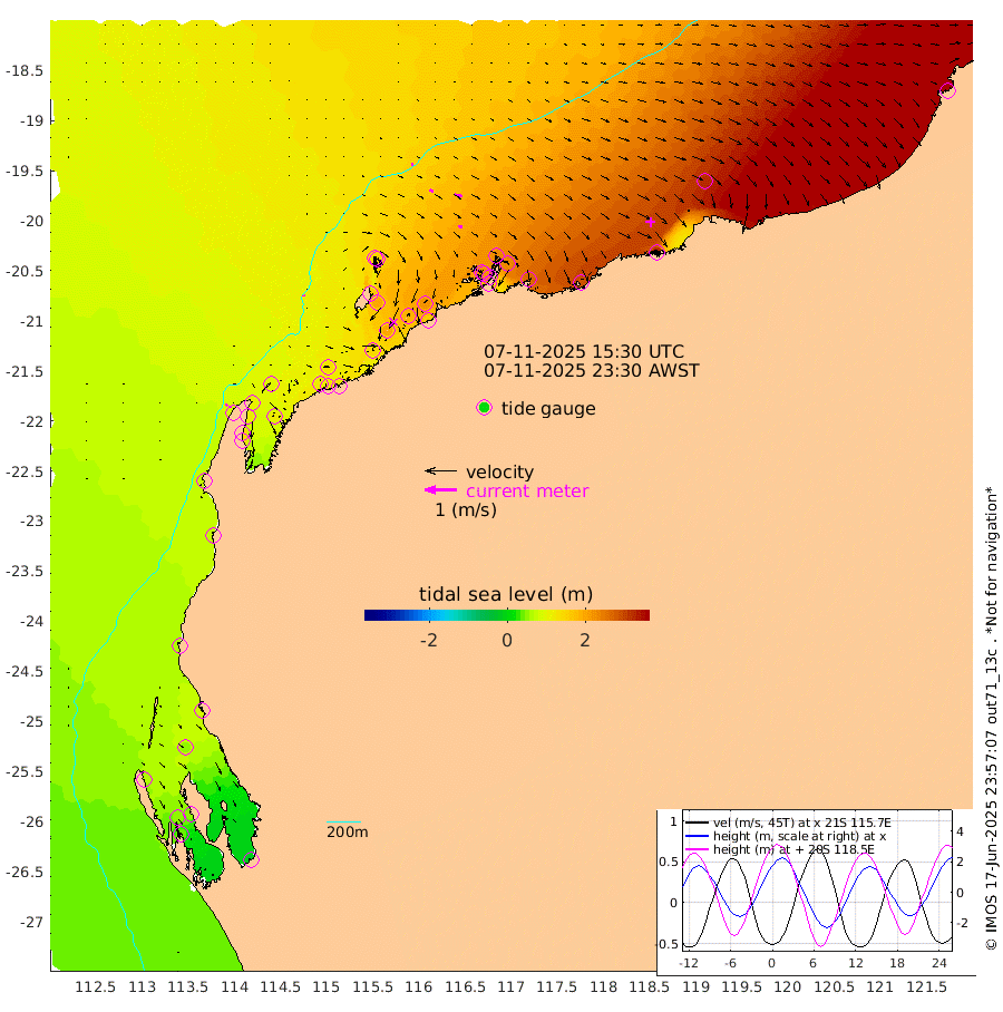 3cm/s -25T +12cm/s rms + 5cm/s -173T. NWSBAR 206m 5cm/s 40T +22cm/s rms + 10cm/s -148T. TAN100 109m 6cm/s 103T +11cm/s rms + 8cm/s -129T. PIL200 208m 11cm/s 102T +13cm/s rms + 7cm/s -137T. PIL100 105m 14cm/s 102T +12cm/s rms + 2cm/s -92T. PIL050 55m 4cm/s 41T +18cm/s rms + 4cm/s -149T. NRSNIN 61m 24cm/s 103T +6cm/s rms + 3cm/s 112T. NW Shelf M6 65m 60cm Withnell Point 50cm Denham 48cm Shark Bay (Inr Bn) 53cm Shark Bay 40cm Useless Loop -13cm Hamelin Pool 81cm Carnarvon 67cm Cape Cuvier 72cm Coral Bay 73cm Norwegian Bay 136cm Badjirrajirra 81cm Tantabiddi 108cm Point Murat 123cm Exmouth 134cm Learmonth 123cm Y Island 99cm North Muiron Island 115cm Roller 120cm Ashburton North 129cm Onslow (Beadon Creek) 124cm Thevenard Island 142cm Large Island 195cm North Sandy Island 162cm Barrow Island (Wapet Landing) 193cm Barrow Island (Tanker Mooring) 220cm Withnell Bay 151cm Trimouille Island 138cm North West Island 164cm Fortescue Road 217cm Steamboat Island 190cm Sholl Island 216cm Fairway Beacon 219cm Mawby Island 220cm Dampier (King Bay) 225cm Cape Legendre 229cm Hauy Island 264cm Port Walcott (Cape Lambert) 285cm Depuch Island 321cm Port Hedland 317cm Bedout Island 401cm Lagrange Bay