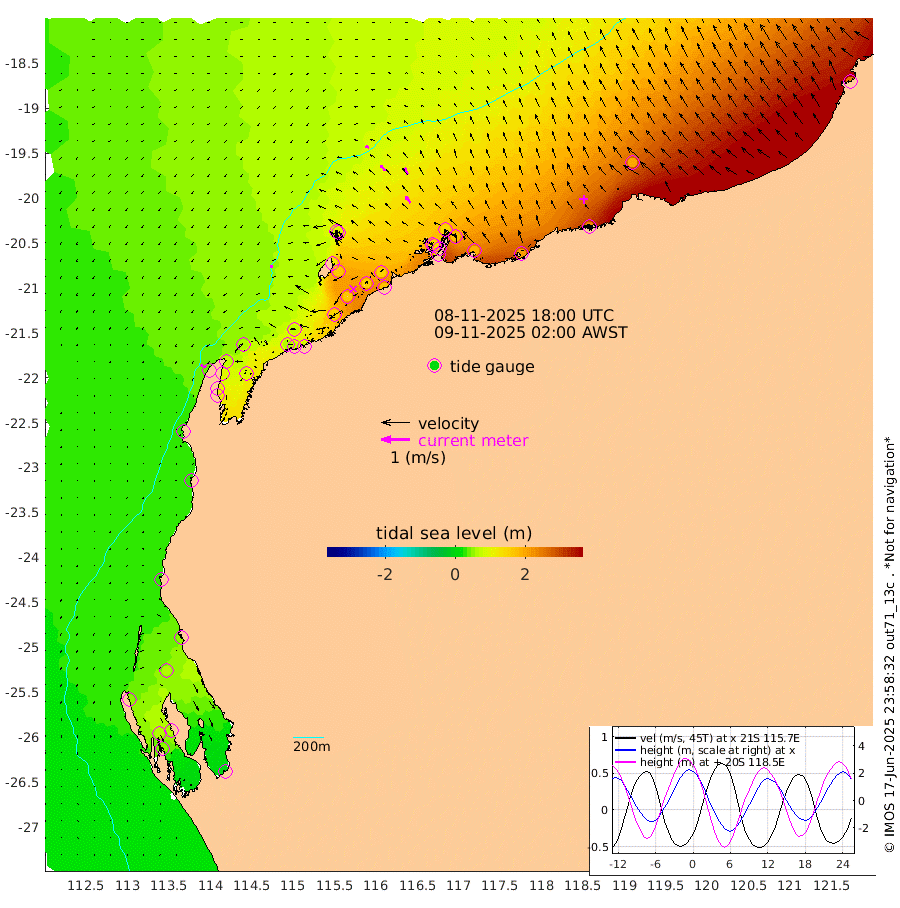 10cm/s -96T +12cm/s rms + 5cm/s -173T. NWSBAR 206m 8cm/s -136T +22cm/s rms + 10cm/s -148T. TAN100 109m 13cm/s -70T +11cm/s rms + 8cm/s -129T. PIL200 208m 24cm/s -44T +13cm/s rms + 7cm/s -137T. PIL100 105m 28cm/s -37T +12cm/s rms + 2cm/s -92T. PIL050 55m 9cm/s -129T +18cm/s rms + 4cm/s -149T. NRSNIN 61m 25cm/s -30T +6cm/s rms + 3cm/s 112T. NW Shelf M6 65m 49cm Withnell Point 62cm Denham 59cm Shark Bay (Inr Bn) 61cm Shark Bay 56cm Useless Loop -3cm Hamelin Pool 54cm Carnarvon 28cm Cape Cuvier 30cm Coral Bay 33cm Norwegian Bay 109cm Badjirrajirra 39cm Tantabiddi 75cm Point Murat 95cm Exmouth 106cm Learmonth 83cm Y Island 57cm North Muiron Island 67cm Roller 71cm Ashburton North 83cm Onslow (Beadon Creek) 74cm Thevenard Island 153cm Large Island 162cm North Sandy Island 114cm Barrow Island (Wapet Landing) 169cm Barrow Island (Tanker Mooring) 143cm Withnell Bay 106cm Trimouille Island 88cm North West Island 169cm Fortescue Road 149cm Steamboat Island 155cm Sholl Island 144cm Fairway Beacon 143cm Mawby Island 145cm Dampier (King Bay) 144cm Cape Legendre 171cm Hauy Island 187cm Port Walcott (Cape Lambert) 205cm Depuch Island 226cm Port Hedland 200cm Bedout Island 258cm Lagrange Bay