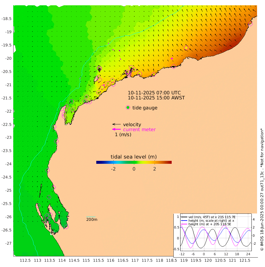 7cm/s -78T +12cm/s rms + 5cm/s -173T. NWSBAR 206m 2cm/s -146T +22cm/s rms + 10cm/s -148T. TAN100 109m 7cm/s -67T +11cm/s rms + 8cm/s -129T. PIL200 208m 13cm/s -44T +13cm/s rms + 7cm/s -137T. PIL100 105m 15cm/s -34T +12cm/s rms + 2cm/s -92T. PIL050 55m 1cm/s -121T +18cm/s rms + 4cm/s -149T. NRSNIN 61m 19cm/s -46T +6cm/s rms + 3cm/s 112T. NW Shelf M6 65m -1cm Withnell Point -16cm Denham -19cm Shark Bay (Inr Bn) -19cm Shark Bay -31cm Useless Loop -19cm Hamelin Pool 16cm Carnarvon 5cm Cape Cuvier 5cm Coral Bay 12cm Norwegian Bay 57cm Badjirrajirra 11cm Tantabiddi 35cm Point Murat 47cm Exmouth 59cm Learmonth 38cm Y Island 21cm North Muiron Island 28cm Roller 34cm Ashburton North 41cm Onslow (Beadon Creek) 35cm Thevenard Island 98cm Large Island 104cm North Sandy Island 64cm Barrow Island (Wapet Landing) 103cm Barrow Island (Tanker Mooring) 89cm Withnell Bay 72cm Trimouille Island 37cm North West Island 117cm Fortescue Road 88cm Steamboat Island 113cm Sholl Island 90cm Fairway Beacon 87cm Mawby Island 90cm Dampier (King Bay) 92cm Cape Legendre 112cm Hauy Island 122cm Port Walcott (Cape Lambert) 132cm Depuch Island 152cm Port Hedland 125cm Bedout Island 182cm Lagrange Bay