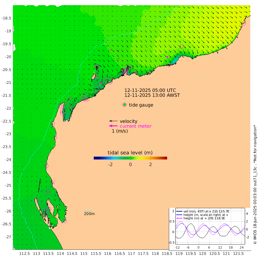 5cm/s 51T +12cm/s rms + 5cm/s -173T. NWSBAR 206m 5cm/s 42T +22cm/s rms + 10cm/s -148T. TAN100 109m 11cm/s 106T +11cm/s rms + 8cm/s -129T. PIL200 208m 17cm/s 125T +13cm/s rms + 7cm/s -137T. PIL100 105m 21cm/s 130T +12cm/s rms + 2cm/s -92T. PIL050 55m 5cm/s 52T +18cm/s rms + 4cm/s -149T. NRSNIN 61m 27cm/s 124T +6cm/s rms + 3cm/s 112T. NW Shelf M6 65m -25cm Withnell Point -37cm Denham -34cm Shark Bay (Inr Bn) -40cm Shark Bay -34cm Useless Loop 3cm Hamelin Pool -18cm Carnarvon -6cm Cape Cuvier -3cm Coral Bay -2cm Norwegian Bay -6cm Badjirrajirra -2cm Tantabiddi -6cm Point Murat -7cm Exmouth 0cm Learmonth 1cm Y Island 1cm North Muiron Island 4cm Roller 4cm Ashburton North 3cm Onslow (Beadon Creek) 3cm Thevenard Island 12cm Large Island 3cm North Sandy Island 6cm Barrow Island (Wapet Landing) -2cm Barrow Island (Tanker Mooring) 24cm Withnell Bay 11cm Trimouille Island 5cm North West Island 24cm Fortescue Road 20cm Steamboat Island 16cm Sholl Island 23cm Fairway Beacon 25cm Mawby Island 25cm Dampier (King Bay) 20cm Cape Legendre 20cm Hauy Island 31cm Port Walcott (Cape Lambert) 34cm Depuch Island 46cm Port Hedland 55cm Bedout Island 165cm Lagrange Bay