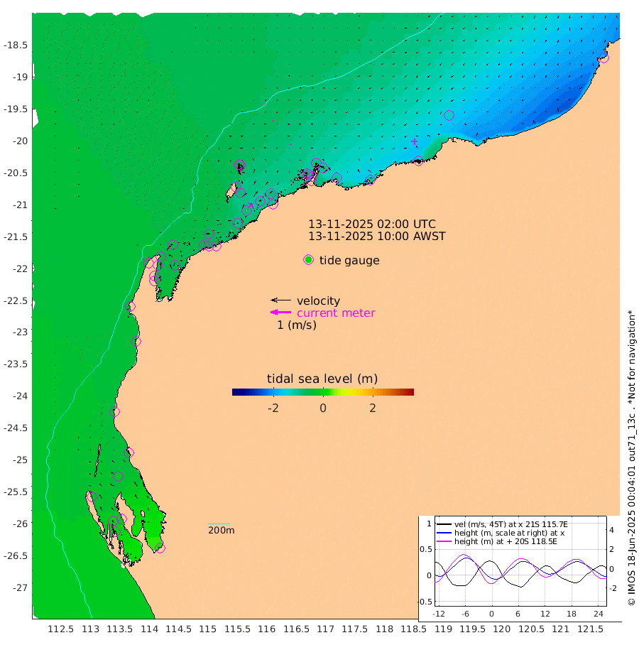 2cm/s -164T +12cm/s rms + 5cm/s -173T. NWSBAR 206m 3cm/s -136T +22cm/s rms + 10cm/s -148T. TAN100 109m 2cm/s -58T +11cm/s rms + 8cm/s -129T. PIL200 208m 3cm/s -73T +13cm/s rms + 7cm/s -137T. PIL100 105m 4cm/s -90T +12cm/s rms + 2cm/s -92T. PIL050 55m 4cm/s -137T +18cm/s rms + 4cm/s -149T. NRSNIN 61m 3cm/s -173T +6cm/s rms + 3cm/s 112T. NW Shelf M6 65m -24cm Withnell Point -13cm Denham -9cm Shark Bay (Inr Bn) -16cm Shark Bay -1cm Useless Loop 16cm Hamelin Pool -41cm Carnarvon -34cm Cape Cuvier -36cm Coral Bay -39cm Norwegian Bay -66cm Badjirrajirra -39cm Tantabiddi -52cm Point Murat -59cm Exmouth -59cm Learmonth -58cm Y Island -46cm North Muiron Island -49cm Roller -55cm Ashburton North -58cm Onslow (Beadon Creek) -57cm Thevenard Island -97cm Large Island -89cm North Sandy Island -73cm Barrow Island (Wapet Landing) -89cm Barrow Island (Tanker Mooring) -92cm Withnell Bay -68cm Trimouille Island -55cm North West Island -111cm Fortescue Road -88cm Steamboat Island -94cm Sholl Island -91cm Fairway Beacon -89cm Mawby Island -93cm Dampier (King Bay) -94cm Cape Legendre -97cm Hauy Island -110cm Port Walcott (Cape Lambert) -105cm Depuch Island -129cm Port Hedland -129cm Bedout Island -176cm Lagrange Bay