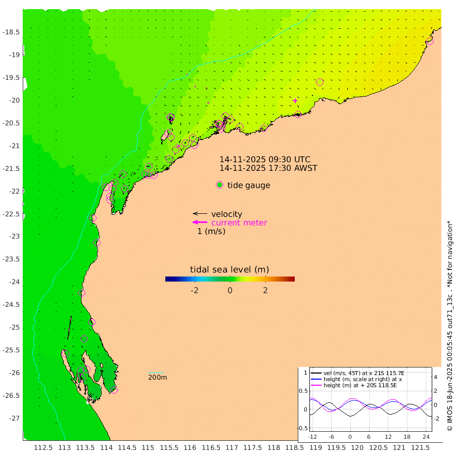 2cm/s 1T +12cm/s rms + 5cm/s -173T. NWSBAR 206m 3cm/s 45T +22cm/s rms + 10cm/s -148T. TAN100 109m 3cm/s 102T +11cm/s rms + 8cm/s -129T. PIL200 208m 6cm/s 112T +13cm/s rms + 7cm/s -137T. PIL100 105m 8cm/s 107T +12cm/s rms + 2cm/s -92T. PIL050 55m 4cm/s 48T +18cm/s rms + 4cm/s -149T. NRSNIN 61m 3cm/s 16T +6cm/s rms + 3cm/s 112T. NW Shelf M6 65m 9cm Withnell Point -2cm Denham -4cm Shark Bay (Inr Bn) -4cm Shark Bay -10cm Useless Loop -12cm Hamelin Pool 22cm Carnarvon 19cm Cape Cuvier 20cm Coral Bay 25cm Norwegian Bay 37cm Badjirrajirra 21cm Tantabiddi 28cm Point Murat 32cm Exmouth 36cm Learmonth 31cm Y Island 26cm North Muiron Island 26cm Roller 32cm Ashburton North 34cm Onslow (Beadon Creek) 33cm Thevenard Island 42cm Large Island 45cm North Sandy Island 42cm Barrow Island (Wapet Landing) 46cm Barrow Island (Tanker Mooring) 56cm Withnell Bay 39cm Trimouille Island 29cm North West Island 57cm Fortescue Road 49cm Steamboat Island 52cm Sholl Island 55cm Fairway Beacon 55cm Mawby Island 56cm Dampier (King Bay) 64cm Cape Legendre 56cm Hauy Island 66cm Port Walcott (Cape Lambert) 63cm Depuch Island 79cm Port Hedland 69cm Bedout Island 93cm Lagrange Bay