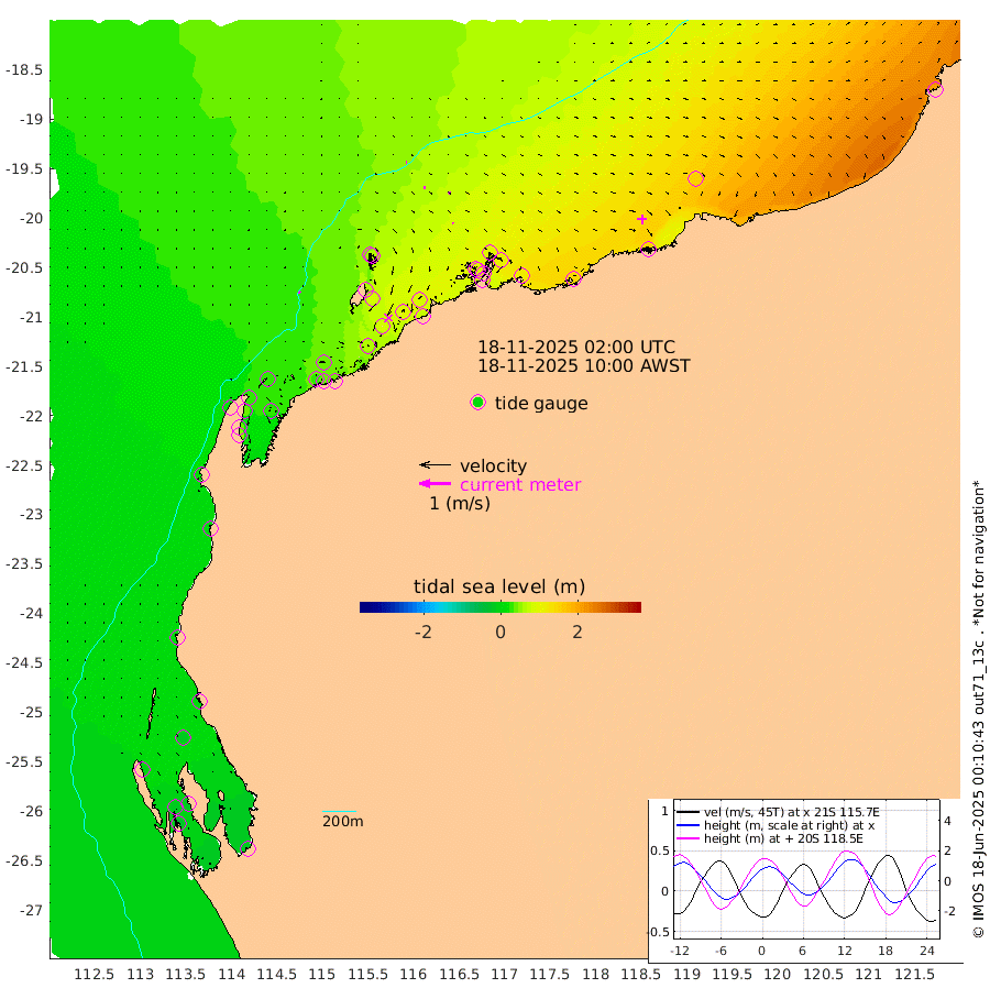 5cm/s -42T +12cm/s rms + 5cm/s -173T. NWSBAR 206m 1cm/s 76T +22cm/s rms + 10cm/s -148T. TAN100 109m 2cm/s 89T +11cm/s rms + 8cm/s -129T. PIL200 208m 4cm/s 95T +13cm/s rms + 7cm/s -137T. PIL100 105m 5cm/s 99T +12cm/s rms + 2cm/s -92T. PIL050 55m 1cm/s 45T +18cm/s rms + 4cm/s -149T. NRSNIN 61m 5cm/s 130T +6cm/s rms + 3cm/s 112T. NW Shelf M6 65m -3cm Withnell Point -16cm Denham -17cm Shark Bay (Inr Bn) -15cm Shark Bay -24cm Useless Loop -13cm Hamelin Pool 11cm Carnarvon 8cm Cape Cuvier 9cm Coral Bay 12cm Norwegian Bay 43cm Badjirrajirra 16cm Tantabiddi 29cm Point Murat 37cm Exmouth 50cm Learmonth 33cm Y Island 23cm North Muiron Island 32cm Roller 37cm Ashburton North 40cm Onslow (Beadon Creek) 39cm Thevenard Island 63cm Large Island 87cm North Sandy Island 61cm Barrow Island (Wapet Landing) 81cm Barrow Island (Tanker Mooring) 94cm Withnell Bay 65cm Trimouille Island 48cm North West Island 78cm Fortescue Road 86cm Steamboat Island 93cm Sholl Island 92cm Fairway Beacon 92cm Mawby Island 96cm Dampier (King Bay) 95cm Cape Legendre 109cm Hauy Island 123cm Port Walcott (Cape Lambert) 137cm Depuch Island 156cm Port Hedland 147cm Bedout Island 204cm Lagrange Bay