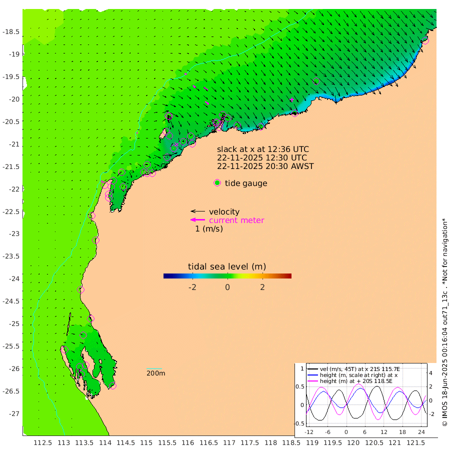 7cm/s 73T +12cm/s rms + 5cm/s -173T. NWSBAR 206m 10cm/s 40T +22cm/s rms + 10cm/s -148T. TAN100 109m 14cm/s 109T +11cm/s rms + 8cm/s -129T. PIL200 208m 26cm/s 128T +13cm/s rms + 7cm/s -137T. PIL100 105m 31cm/s 130T +12cm/s rms + 2cm/s -92T. PIL050 55m 10cm/s 48T +18cm/s rms + 4cm/s -149T. NRSNIN 61m 33cm/s 131T +6cm/s rms + 3cm/s 112T. NW Shelf M6 65m 26cm Withnell Point 15cm Denham 14cm Shark Bay (Inr Bn) 20cm Shark Bay 13cm Useless Loop -6cm Hamelin Pool 32cm Carnarvon 40cm Cape Cuvier 41cm Coral Bay 39cm Norwegian Bay 7cm Badjirrajirra 38cm Tantabiddi 21cm Point Murat 13cm Exmouth 1cm Learmonth 24cm Y Island 33cm North Muiron Island 33cm Roller 29cm Ashburton North 24cm Onslow (Beadon Creek) 30cm Thevenard Island -51cm Large Island -16cm North Sandy Island 12cm Barrow Island (Wapet Landing) -19cm Barrow Island (Tanker Mooring) 14cm Withnell Bay 12cm Trimouille Island 23cm North West Island -65cm Fortescue Road 16cm Steamboat Island -22cm Sholl Island 11cm Fairway Beacon 12cm Mawby Island 11cm Dampier (King Bay) 20cm Cape Legendre -9cm Hauy Island -5cm Port Walcott (Cape Lambert) -7cm Depuch Island -15cm Port Hedland 8cm Bedout Island -35cm Lagrange Bay