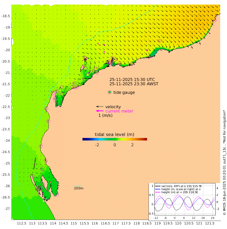 5cm/s 59T +12cm/s rms + 5cm/s -173T. NWSBAR 206m 8cm/s 39T +22cm/s rms + 10cm/s -148T. TAN100 109m 12cm/s 111T +11cm/s rms + 8cm/s -129T. PIL200 208m 19cm/s 125T +13cm/s rms + 7cm/s -137T. PIL100 105m 24cm/s 127T +12cm/s rms + 2cm/s -92T. PIL050 55m 7cm/s 45T +18cm/s rms + 4cm/s -149T. NRSNIN 61m 35cm/s 120T +6cm/s rms + 3cm/s 112T. NW Shelf M6 65m 34cm Withnell Point 24cm Denham 22cm Shark Bay (Inr Bn) 30cm Shark Bay 21cm Useless Loop -6cm Hamelin Pool 46cm Carnarvon 47cm Cape Cuvier 50cm Coral Bay 47cm Norwegian Bay 56cm Badjirrajirra 52cm Tantabiddi 53cm Point Murat 53cm Exmouth 49cm Learmonth 61cm Y Island 56cm North Muiron Island 63cm Roller 62cm Ashburton North 63cm Onslow (Beadon Creek) 64cm Thevenard Island 36cm Large Island 66cm North Sandy Island 69cm Barrow Island (Wapet Landing) 64cm Barrow Island (Tanker Mooring) 93cm Withnell Bay 60cm Trimouille Island 69cm North West Island 37cm Fortescue Road 101cm Steamboat Island 62cm Sholl Island 91cm Fairway Beacon 94cm Mawby Island 93cm Dampier (King Bay) 95cm Cape Legendre 86cm Hauy Island 101cm Port Walcott (Cape Lambert) 108cm Depuch Island 119cm Port Hedland 137cm Bedout Island 182cm Lagrange Bay