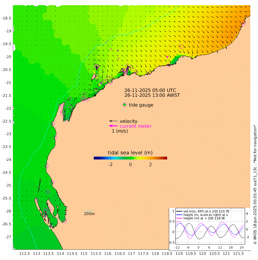 4cm/s 20T +12cm/s rms + 5cm/s -173T. NWSBAR 206m 5cm/s 42T +22cm/s rms + 10cm/s -148T. TAN100 109m 10cm/s 105T +11cm/s rms + 8cm/s -129T. PIL200 208m 14cm/s 122T +13cm/s rms + 7cm/s -137T. PIL100 105m 17cm/s 125T +12cm/s rms + 2cm/s -92T. PIL050 55m 5cm/s 48T +18cm/s rms + 4cm/s -149T. NRSNIN 61m 21cm/s 119T +6cm/s rms + 3cm/s 112T. NW Shelf M6 65m -16cm Withnell Point -36cm Denham -33cm Shark Bay (Inr Bn) -38cm Shark Bay -40cm Useless Loop -7cm Hamelin Pool -1cm Carnarvon 5cm Cape Cuvier 7cm Coral Bay 10cm Norwegian Bay 25cm Badjirrajirra 11cm Tantabiddi 16cm Point Murat 20cm Exmouth 30cm Learmonth 25cm Y Island 17cm North Muiron Island 26cm Roller 26cm Ashburton North 28cm Onslow (Beadon Creek) 27cm Thevenard Island 44cm Large Island 54cm North Sandy Island 41cm Barrow Island (Wapet Landing) 48cm Barrow Island (Tanker Mooring) 72cm Withnell Bay 47cm Trimouille Island 27cm North West Island 62cm Fortescue Road 64cm Steamboat Island 65cm Sholl Island 71cm Fairway Beacon 74cm Mawby Island 72cm Dampier (King Bay) 74cm Cape Legendre 76cm Hauy Island 91cm Port Walcott (Cape Lambert) 101cm Depuch Island 120cm Port Hedland 119cm Bedout Island 239cm Lagrange Bay