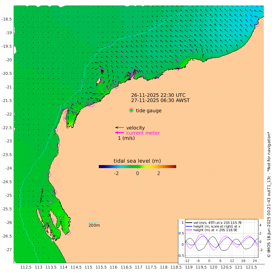 4cm/s -131T +12cm/s rms + 5cm/s -173T. NWSBAR 206m 10cm/s -141T +22cm/s rms + 10cm/s -148T. TAN100 109m 11cm/s -73T +11cm/s rms + 8cm/s -129T. PIL200 208m 19cm/s -55T +13cm/s rms + 7cm/s -137T. PIL100 105m 23cm/s -53T +12cm/s rms + 2cm/s -92T. PIL050 55m 9cm/s -134T +18cm/s rms + 4cm/s -149T. NRSNIN 61m 31cm/s -58T +6cm/s rms + 3cm/s 112T. NW Shelf M6 65m -8cm Withnell Point 14cm Denham 15cm Shark Bay (Inr Bn) 12cm Shark Bay 21cm Useless Loop 12cm Hamelin Pool -26cm Carnarvon -33cm Cape Cuvier -34cm Coral Bay -33cm Norwegian Bay -36cm Badjirrajirra -35cm Tantabiddi -34cm Point Murat -33cm Exmouth -34cm Learmonth -40cm Y Island -37cm North Muiron Island -43cm Roller -43cm Ashburton North -43cm Onslow (Beadon Creek) -44cm Thevenard Island -22cm Large Island -49cm North Sandy Island -48cm Barrow Island (Wapet Landing) -44cm Barrow Island (Tanker Mooring) -71cm Withnell Bay -46cm Trimouille Island -43cm North West Island -29cm Fortescue Road -72cm Steamboat Island -50cm Sholl Island -70cm Fairway Beacon -74cm Mawby Island -71cm Dampier (King Bay) -76cm Cape Legendre -64cm Hauy Island -79cm Port Walcott (Cape Lambert) -80cm Depuch Island -95cm Port Hedland -104cm Bedout Island -161cm Lagrange Bay