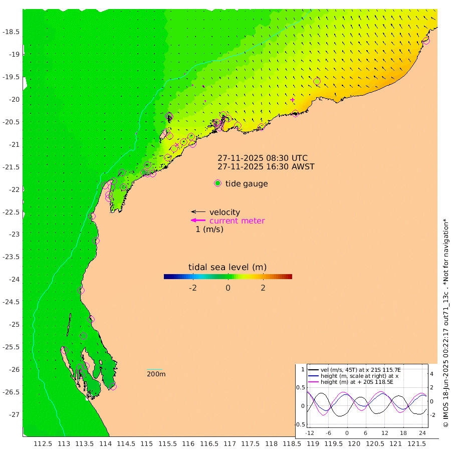 5cm/s -87T +12cm/s rms + 5cm/s -173T. NWSBAR 206m 1cm/s -132T +22cm/s rms + 10cm/s -148T. TAN100 109m 5cm/s -67T +11cm/s rms + 8cm/s -129T. PIL200 208m 8cm/s -45T +13cm/s rms + 7cm/s -137T. PIL100 105m 10cm/s -32T +12cm/s rms + 2cm/s -92T. PIL050 55m 0cm/s 8T +18cm/s rms + 4cm/s -149T. NRSNIN 61m 18cm/s -43T +6cm/s rms + 3cm/s 112T. NW Shelf M6 65m 7cm Withnell Point -3cm Denham -5cm Shark Bay (Inr Bn) -6cm Shark Bay -15cm Useless Loop -15cm Hamelin Pool 19cm Carnarvon 9cm Cape Cuvier 9cm Coral Bay 14cm Norwegian Bay 39cm Badjirrajirra 12cm Tantabiddi 26cm Point Murat 33cm Exmouth 40cm Learmonth 29cm Y Island 18cm North Muiron Island 22cm Roller 25cm Ashburton North 29cm Onslow (Beadon Creek) 26cm Thevenard Island 69cm Large Island 67cm North Sandy Island 41cm Barrow Island (Wapet Landing) 64cm Barrow Island (Tanker Mooring) 54cm Withnell Bay 42cm Trimouille Island 22cm North West Island 85cm Fortescue Road 47cm Steamboat Island 65cm Sholl Island 54cm Fairway Beacon 53cm Mawby Island 54cm Dampier (King Bay) 56cm Cape Legendre 65cm Hauy Island 71cm Port Walcott (Cape Lambert) 82cm Depuch Island 86cm Port Hedland 65cm Bedout Island 113cm Lagrange Bay