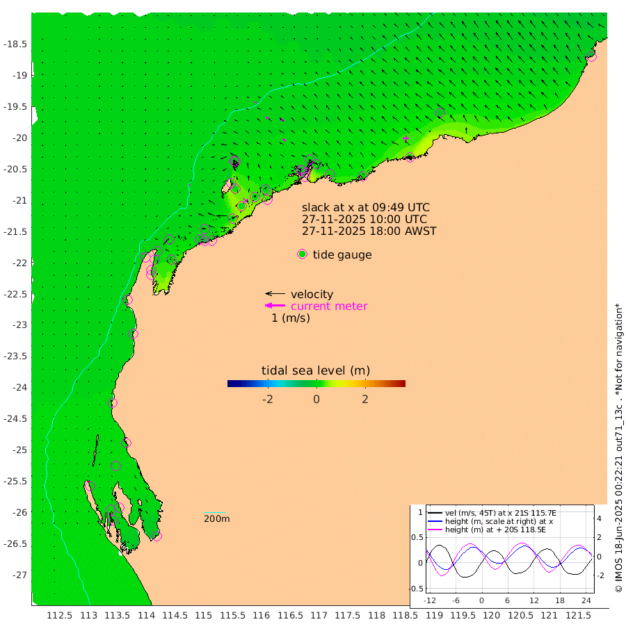 5cm/s -114T +12cm/s rms + 5cm/s -173T. NWSBAR 206m 2cm/s -137T +22cm/s rms + 10cm/s -148T. TAN100 109m 10cm/s -74T +11cm/s rms + 8cm/s -129T. PIL200 208m 13cm/s -54T +13cm/s rms + 7cm/s -137T. PIL100 105m 16cm/s -47T +12cm/s rms + 2cm/s -92T. PIL050 55m 1cm/s -107T +18cm/s rms + 4cm/s -149T. NRSNIN 61m 23cm/s -53T +6cm/s rms + 3cm/s 112T. NW Shelf M6 65m 8cm Withnell Point 6cm Denham 2cm Shark Bay (Inr Bn) 3cm Shark Bay -4cm Useless Loop -12cm Hamelin Pool 11cm Carnarvon 1cm Cape Cuvier 0cm Coral Bay 3cm Norwegian Bay 12cm Badjirrajirra 0cm Tantabiddi 7cm Point Murat 10cm Exmouth 11cm Learmonth 4cm Y Island 1cm North Muiron Island 0cm Roller 2cm Ashburton North 3cm Onslow (Beadon Creek) 1cm Thevenard Island 21cm Large Island 21cm North Sandy Island 6cm Barrow Island (Wapet Landing) 20cm Barrow Island (Tanker Mooring) 0cm Withnell Bay 5cm Trimouille Island -3cm North West Island 28cm Fortescue Road -5cm Steamboat Island 11cm Sholl Island 1cm Fairway Beacon -1cm Mawby Island 0cm Dampier (King Bay) 1cm Cape Legendre 6cm Hauy Island 3cm Port Walcott (Cape Lambert) 8cm Depuch Island -1cm Port Hedland -20cm Bedout Island -38cm Lagrange Bay
