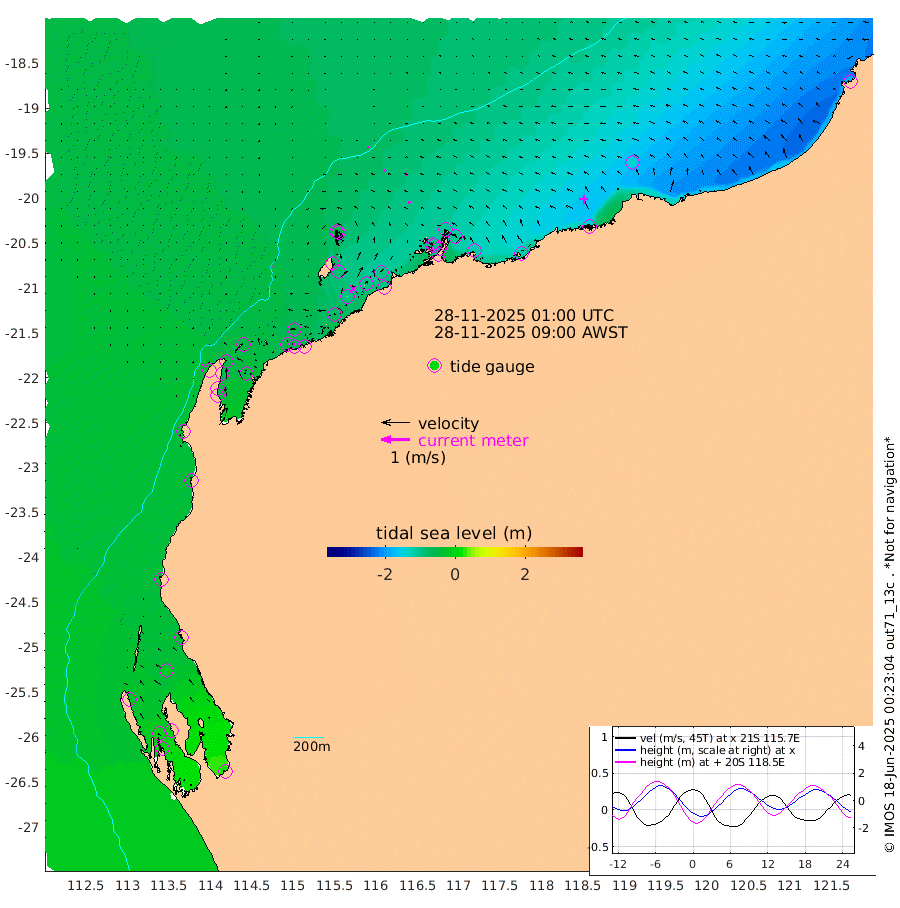 2cm/s -170T +12cm/s rms + 5cm/s -173T. NWSBAR 206m 5cm/s -142T +22cm/s rms + 10cm/s -148T. TAN100 109m 4cm/s -68T +11cm/s rms + 8cm/s -129T. PIL200 208m 6cm/s -62T +13cm/s rms + 7cm/s -137T. PIL100 105m 8cm/s -68T +12cm/s rms + 2cm/s -92T. PIL050 55m 5cm/s -138T +18cm/s rms + 4cm/s -149T. NRSNIN 61m 8cm/s -99T +6cm/s rms + 3cm/s 112T. NW Shelf M6 65m -24cm Withnell Point -11cm Denham -7cm Shark Bay (Inr Bn) -13cm Shark Bay 0cm Useless Loop 14cm Hamelin Pool -42cm Carnarvon -37cm Cape Cuvier -38cm Coral Bay -41cm Norwegian Bay -67cm Badjirrajirra -42cm Tantabiddi -54cm Point Murat -60cm Exmouth -60cm Learmonth -62cm Y Island -49cm North Muiron Island -55cm Roller -58cm Ashburton North -62cm Onslow (Beadon Creek) -60cm Thevenard Island -77cm Large Island -91cm North Sandy Island -75cm Barrow Island (Wapet Landing) -90cm Barrow Island (Tanker Mooring) -99cm Withnell Bay -65cm Trimouille Island -60cm North West Island -91cm Fortescue Road -100cm Steamboat Island -93cm Sholl Island -99cm Fairway Beacon -102cm Mawby Island -100cm Dampier (King Bay) -103cm Cape Legendre -103cm Hauy Island -117cm Port Walcott (Cape Lambert) -121cm Depuch Island -140cm Port Hedland -140cm Bedout Island -187cm Lagrange Bay