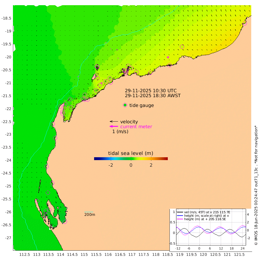 4cm/s -86T +12cm/s rms + 5cm/s -173T. NWSBAR 206m 0cm/s -121T +22cm/s rms + 10cm/s -148T. TAN100 109m 5cm/s -71T +11cm/s rms + 8cm/s -129T. PIL200 208m 5cm/s -40T +13cm/s rms + 7cm/s -137T. PIL100 105m 7cm/s -25T +12cm/s rms + 2cm/s -92T. PIL050 55m 1cm/s 30T +18cm/s rms + 4cm/s -149T. NRSNIN 61m 12cm/s -46T +6cm/s rms + 3cm/s 112T. NW Shelf M6 65m 19cm Withnell Point 14cm Denham 11cm Shark Bay (Inr Bn) 13cm Shark Bay 4cm Useless Loop -12cm Hamelin Pool 27cm Carnarvon 16cm Cape Cuvier 16cm Coral Bay 21cm Norwegian Bay 41cm Badjirrajirra 19cm Tantabiddi 31cm Point Murat 37cm Exmouth 38cm Learmonth 34cm Y Island 25cm North Muiron Island 29cm Roller 31cm Ashburton North 34cm Onslow (Beadon Creek) 32cm Thevenard Island 40cm Large Island 63cm North Sandy Island 44cm Barrow Island (Wapet Landing) 61cm Barrow Island (Tanker Mooring) 57cm Withnell Bay 45cm Trimouille Island 27cm North West Island 54cm Fortescue Road 49cm Steamboat Island 56cm Sholl Island 56cm Fairway Beacon 54cm Mawby Island 56cm Dampier (King Bay) 62cm Cape Legendre 63cm Hauy Island 70cm Port Walcott (Cape Lambert) 81cm Depuch Island 83cm Port Hedland 72cm Bedout Island 73cm Lagrange Bay