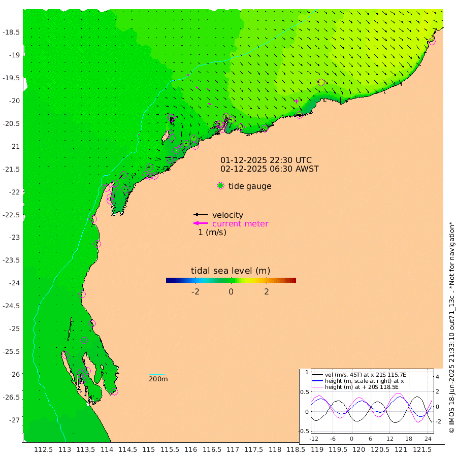7cm/s 39T +12cm/s rms + 5cm/s -173T. NWSBAR 206m 3cm/s 55T +22cm/s rms + 10cm/s -148T. TAN100 109m 11cm/s 106T +11cm/s rms + 8cm/s -129T. PIL200 208m 16cm/s 127T +13cm/s rms + 7cm/s -137T. PIL100 105m 19cm/s 131T +12cm/s rms + 2cm/s -92T. PIL050 55m 3cm/s 50T +18cm/s rms + 4cm/s -149T. NRSNIN 61m 11cm/s 125T +6cm/s rms + 3cm/s 112T. NW Shelf M6 65m -17cm Withnell Point -30cm Denham -29cm Shark Bay (Inr Bn) -27cm Shark Bay -32cm Useless Loop -5cm Hamelin Pool -7cm Carnarvon 0cm Cape Cuvier 1cm Coral Bay 4cm Norwegian Bay 5cm Badjirrajirra 4cm Tantabiddi 2cm Point Murat 3cm Exmouth 5cm Learmonth 8cm Y Island 5cm North Muiron Island 9cm Roller 11cm Ashburton North 10cm Onslow (Beadon Creek) 12cm Thevenard Island -25cm Large Island 10cm North Sandy Island 15cm Barrow Island (Wapet Landing) 6cm Barrow Island (Tanker Mooring) 35cm Withnell Bay 6cm Trimouille Island 12cm North West Island -13cm Fortescue Road 26cm Steamboat Island 32cm Sholl Island 32cm Fairway Beacon 37cm Mawby Island 34cm Dampier (King Bay) 40cm Cape Legendre 34cm Hauy Island 40cm Port Walcott (Cape Lambert) 30cm Depuch Island 55cm Port Hedland 63cm Bedout Island 34cm Lagrange Bay