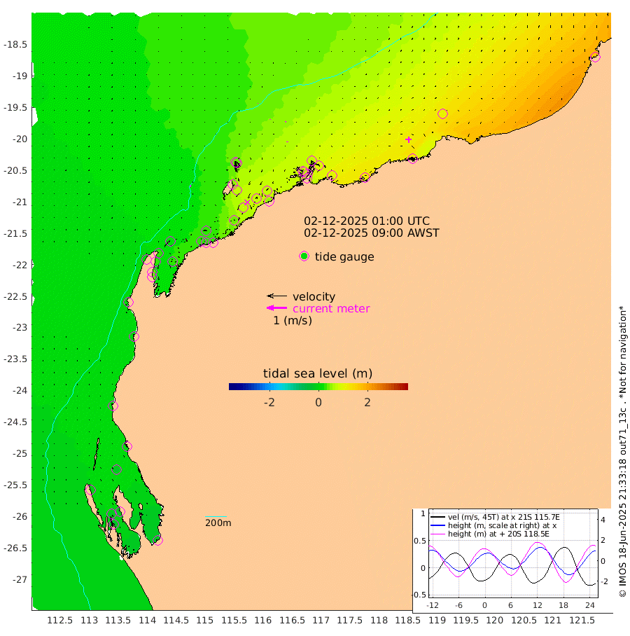5cm/s -58T +12cm/s rms + 5cm/s -173T. NWSBAR 206m 1cm/s 162T +22cm/s rms + 10cm/s -148T. TAN100 109m 1cm/s -16T +11cm/s rms + 8cm/s -129T. PIL200 208m 2cm/s 8T +13cm/s rms + 7cm/s -137T. PIL100 105m 2cm/s 3T +12cm/s rms + 2cm/s -92T. PIL050 55m 0cm/s -88T +18cm/s rms + 4cm/s -149T. NRSNIN 61m 3cm/s 58T +6cm/s rms + 3cm/s 112T. NW Shelf M6 65m -1cm Withnell Point -13cm Denham -15cm Shark Bay (Inr Bn) -13cm Shark Bay -23cm Useless Loop -14cm Hamelin Pool 10cm Carnarvon 5cm Cape Cuvier 5cm Coral Bay 8cm Norwegian Bay 36cm Badjirrajirra 11cm Tantabiddi 23cm Point Murat 30cm Exmouth 42cm Learmonth 27cm Y Island 17cm North Muiron Island 27cm Roller 28cm Ashburton North 31cm Onslow (Beadon Creek) 29cm Thevenard Island 39cm Large Island 73cm North Sandy Island 49cm Barrow Island (Wapet Landing) 68cm Barrow Island (Tanker Mooring) 75cm Withnell Bay 44cm Trimouille Island 39cm North West Island 55cm Fortescue Road 70cm Steamboat Island 73cm Sholl Island 73cm Fairway Beacon 76cm Mawby Island 75cm Dampier (King Bay) 78cm Cape Legendre 91cm Hauy Island 98cm Port Walcott (Cape Lambert) 116cm Depuch Island 124cm Port Hedland 104cm Bedout Island 160cm Lagrange Bay