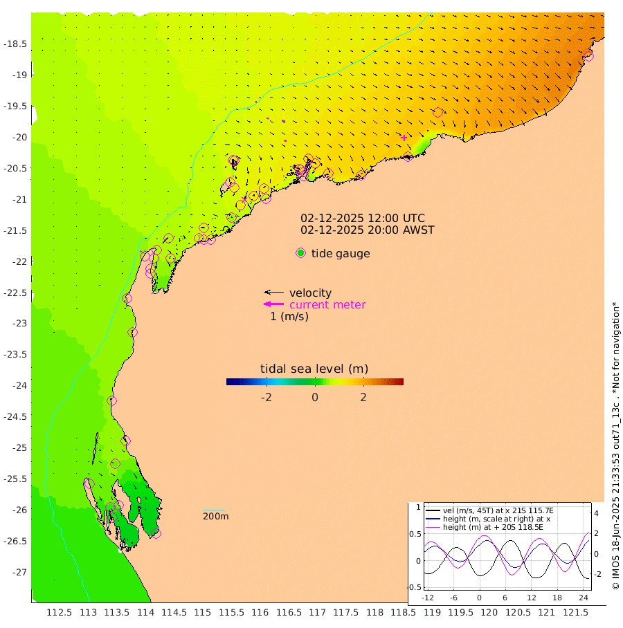 3cm/s -24T +12cm/s rms + 5cm/s -173T. NWSBAR 206m 4cm/s 41T +22cm/s rms + 10cm/s -148T. TAN100 109m 4cm/s 104T +11cm/s rms + 8cm/s -129T. PIL200 208m 10cm/s 109T +13cm/s rms + 7cm/s -137T. PIL100 105m 12cm/s 108T +12cm/s rms + 2cm/s -92T. PIL050 55m 4cm/s 43T +18cm/s rms + 4cm/s -149T. NRSNIN 61m 14cm/s 110T +6cm/s rms + 3cm/s 112T. NW Shelf M6 65m 43cm Withnell Point 35cm Denham 33cm Shark Bay (Inr Bn) 37cm Shark Bay 27cm Useless Loop -11cm Hamelin Pool 57cm Carnarvon 47cm Cape Cuvier 49cm Coral Bay 53cm Norwegian Bay 81cm Badjirrajirra 54cm Tantabiddi 67cm Point Murat 75cm Exmouth 76cm Learmonth 76cm Y Island 64cm North Muiron Island 72cm Roller 75cm Ashburton North 79cm Onslow (Beadon Creek) 77cm Thevenard Island 54cm Large Island 107cm North Sandy Island 95cm Barrow Island (Wapet Landing) 106cm Barrow Island (Tanker Mooring) 128cm Withnell Bay 91cm Trimouille Island 78cm North West Island 70cm Fortescue Road 123cm Steamboat Island 101cm Sholl Island 124cm Fairway Beacon 124cm Mawby Island 126cm Dampier (King Bay) 138cm Cape Legendre 128cm Hauy Island 148cm Port Walcott (Cape Lambert) 160cm Depuch Island 176cm Port Hedland 176cm Bedout Island 189cm Lagrange Bay
