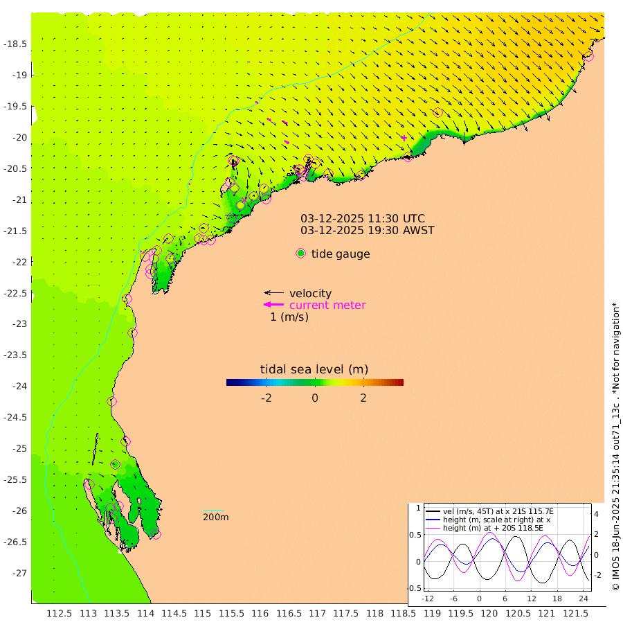 5cm/s 53T +12cm/s rms + 5cm/s -173T. NWSBAR 206m 9cm/s 41T +22cm/s rms + 10cm/s -148T. TAN100 109m 12cm/s 107T +11cm/s rms + 8cm/s -129T. PIL200 208m 23cm/s 121T +13cm/s rms + 7cm/s -137T. PIL100 105m 28cm/s 122T +12cm/s rms + 2cm/s -92T. PIL050 55m 9cm/s 46T +18cm/s rms + 4cm/s -149T. NRSNIN 61m 27cm/s 120T +6cm/s rms + 3cm/s 112T. NW Shelf M6 65m 42cm Withnell Point 29cm Denham 28cm Shark Bay (Inr Bn) 32cm Shark Bay 23cm Useless Loop -11cm Hamelin Pool 57cm Carnarvon 57cm Cape Cuvier 59cm Coral Bay 61cm Norwegian Bay 66cm Badjirrajirra 61cm Tantabiddi 62cm Point Murat 63cm Exmouth 61cm Learmonth 69cm Y Island 65cm North Muiron Island 69cm Roller 72cm Ashburton North 73cm Onslow (Beadon Creek) 74cm Thevenard Island 18cm Large Island 69cm North Sandy Island 79cm Barrow Island (Wapet Landing) 68cm Barrow Island (Tanker Mooring) 104cm Withnell Bay 73cm Trimouille Island 72cm North West Island 23cm Fortescue Road 99cm Steamboat Island 70cm Sholl Island 100cm Fairway Beacon 102cm Mawby Island 102cm Dampier (King Bay) 116cm Cape Legendre 91cm Hauy Island 109cm Port Walcott (Cape Lambert) 108cm Depuch Island 126cm Port Hedland 133cm Bedout Island 117cm Lagrange Bay