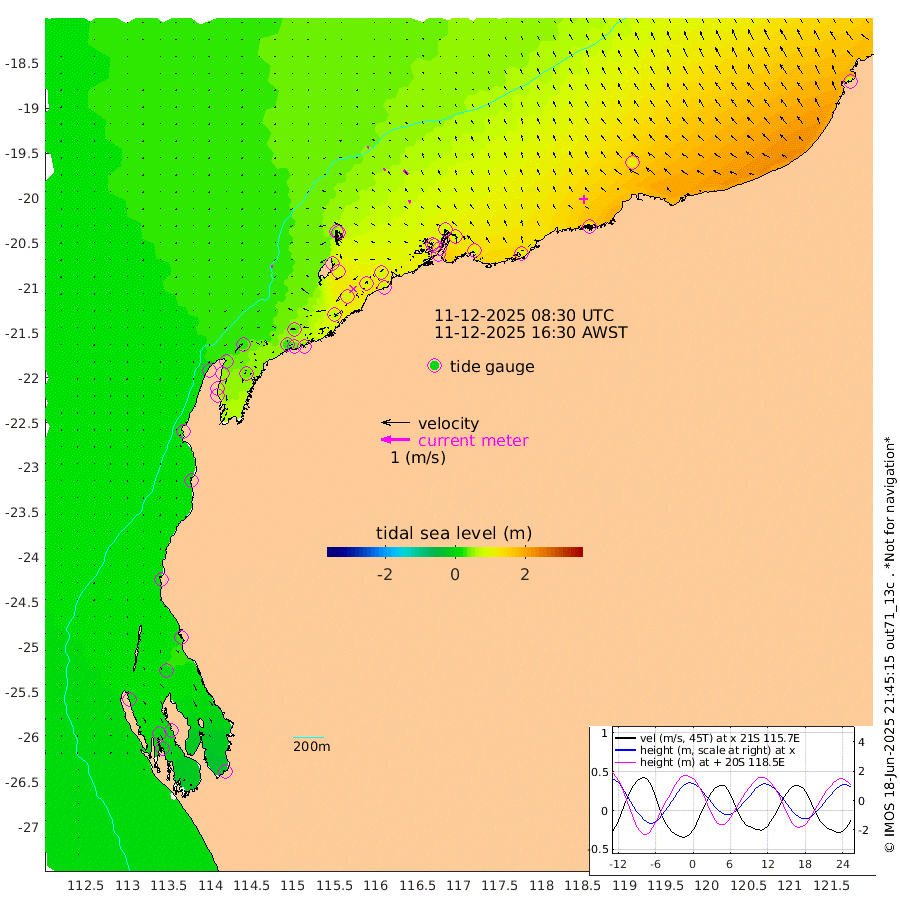 5cm/s -88T +12cm/s rms + 5cm/s -173T. NWSBAR 206m 1cm/s -145T +22cm/s rms + 10cm/s -148T. TAN100 109m 6cm/s -70T +11cm/s rms + 8cm/s -129T. PIL200 208m 9cm/s -40T +13cm/s rms + 7cm/s -137T. PIL100 105m 11cm/s -28T +12cm/s rms + 2cm/s -92T. PIL050 55m 1cm/s -94T +18cm/s rms + 4cm/s -149T. NRSNIN 61m 21cm/s -44T +6cm/s rms + 3cm/s 112T. NW Shelf M6 65m 15cm Withnell Point 8cm Denham 4cm Shark Bay (Inr Bn) 3cm Shark Bay -5cm Useless Loop -16cm Hamelin Pool 29cm Carnarvon 17cm Cape Cuvier 17cm Coral Bay 23cm Norwegian Bay 59cm Badjirrajirra 21cm Tantabiddi 41cm Point Murat 51cm Exmouth 58cm Learmonth 42cm Y Island 30cm North Muiron Island 32cm Roller 40cm Ashburton North 46cm Onslow (Beadon Creek) 41cm Thevenard Island 71cm Large Island 90cm North Sandy Island 63cm Barrow Island (Wapet Landing) 91cm Barrow Island (Tanker Mooring) 82cm Withnell Bay 65cm Trimouille Island 42cm North West Island 85cm Fortescue Road 83cm Steamboat Island 96cm Sholl Island 82cm Fairway Beacon 80cm Mawby Island 82cm Dampier (King Bay) 88cm Cape Legendre 96cm Hauy Island 106cm Port Walcott (Cape Lambert) 113cm Depuch Island 128cm Port Hedland 105cm Bedout Island 78cm Lagrange Bay