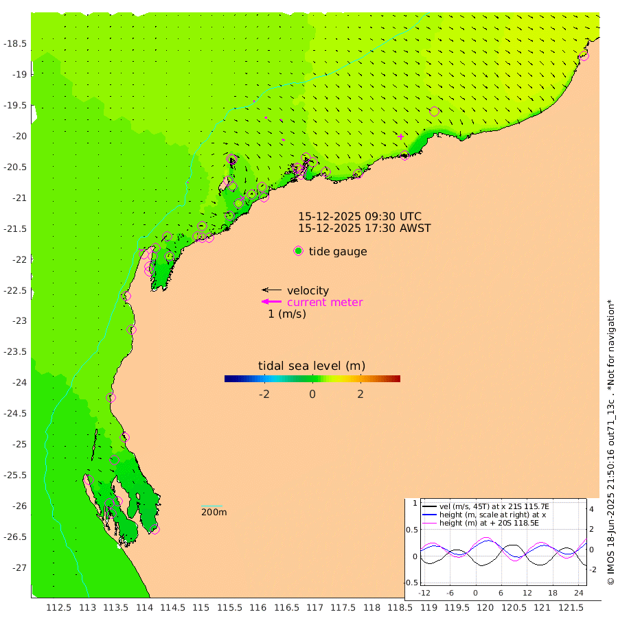 2cm/s 46T +12cm/s rms + 5cm/s -173T. NWSBAR 206m 5cm/s 39T +22cm/s rms + 10cm/s -148T. TAN100 109m 6cm/s 101T +11cm/s rms + 8cm/s -129T. PIL200 208m 11cm/s 118T +13cm/s rms + 7cm/s -137T. PIL100 105m 14cm/s 117T +12cm/s rms + 2cm/s -92T. PIL050 55m 6cm/s 46T +18cm/s rms + 4cm/s -149T. NRSNIN 61m 9cm/s 109T +6cm/s rms + 3cm/s 112T. NW Shelf M6 65m 27cm Withnell Point 17cm Denham 16cm Shark Bay (Inr Bn) 17cm Shark Bay 10cm Useless Loop -11cm Hamelin Pool 39cm Carnarvon 38cm Cape Cuvier 39cm Coral Bay 42cm Norwegian Bay 45cm Badjirrajirra 39cm Tantabiddi 41cm Point Murat 42cm Exmouth 44cm Learmonth 47cm Y Island 42cm North Muiron Island 45cm Roller 47cm Ashburton North 46cm Onslow (Beadon Creek) 47cm Thevenard Island 37cm Large Island 50cm North Sandy Island 50cm Barrow Island (Wapet Landing) 46cm Barrow Island (Tanker Mooring) 63cm Withnell Bay 46cm Trimouille Island 42cm North West Island 43cm Fortescue Road 51cm Steamboat Island 50cm Sholl Island 60cm Fairway Beacon 63cm Mawby Island 62cm Dampier (King Bay) 67cm Cape Legendre 53cm Hauy Island 66cm Port Walcott (Cape Lambert) 63cm Depuch Island 74cm Port Hedland 70cm Bedout Island 88cm Lagrange Bay