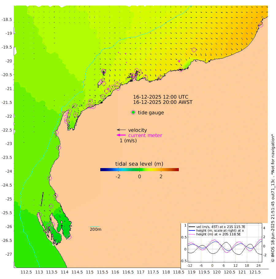2cm/s -57T +12cm/s rms + 5cm/s -173T. NWSBAR 206m 3cm/s 40T +22cm/s rms + 10cm/s -148T. TAN100 109m 1cm/s 104T +11cm/s rms + 8cm/s -129T. PIL200 208m 6cm/s 99T +13cm/s rms + 7cm/s -137T. PIL100 105m 7cm/s 100T +12cm/s rms + 2cm/s -92T. PIL050 55m 3cm/s 42T +18cm/s rms + 4cm/s -149T. NRSNIN 61m 11cm/s 106T +6cm/s rms + 3cm/s 112T. NW Shelf M6 65m 40cm Withnell Point 36cm Denham 33cm Shark Bay (Inr Bn) 38cm Shark Bay 30cm Useless Loop -9cm Hamelin Pool 50cm Carnarvon 41cm Cape Cuvier 44cm Coral Bay 45cm Norwegian Bay 67cm Badjirrajirra 46cm Tantabiddi 56cm Point Murat 62cm Exmouth 66cm Learmonth 62cm Y Island 52cm North Muiron Island 59cm Roller 62cm Ashburton North 64cm Onslow (Beadon Creek) 64cm Thevenard Island 59cm Large Island 87cm North Sandy Island 77cm Barrow Island (Wapet Landing) 86cm Barrow Island (Tanker Mooring) 97cm Withnell Bay 68cm Trimouille Island 64cm North West Island 76cm Fortescue Road 84cm Steamboat Island 76cm Sholl Island 95cm Fairway Beacon 96cm Mawby Island 97cm Dampier (King Bay) 103cm Cape Legendre 95cm Hauy Island 112cm Port Walcott (Cape Lambert) 114cm Depuch Island 131cm Port Hedland 127cm Bedout Island 172cm Lagrange Bay