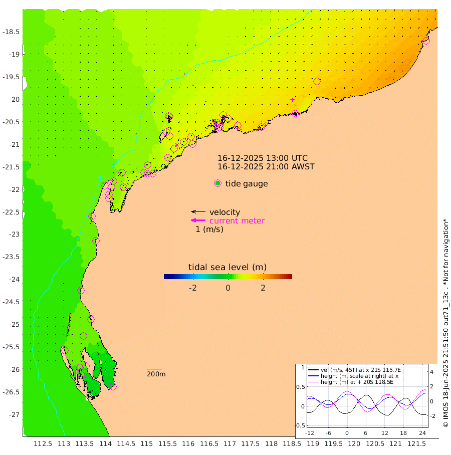 4cm/s -89T +12cm/s rms + 5cm/s -173T. NWSBAR 206m 1cm/s 29T +22cm/s rms + 10cm/s -148T. TAN100 109m 3cm/s -77T +11cm/s rms + 8cm/s -129T. PIL200 208m 4cm/s -6T +13cm/s rms + 7cm/s -137T. PIL100 105m 4cm/s 11T +12cm/s rms + 2cm/s -92T. PIL050 55m 1cm/s 14T +18cm/s rms + 4cm/s -149T. NRSNIN 61m 6cm/s 81T +6cm/s rms + 3cm/s 112T. NW Shelf M6 65m 39cm Withnell Point 41cm Denham 38cm Shark Bay (Inr Bn) 42cm Shark Bay 36cm Useless Loop -5cm Hamelin Pool 45cm Carnarvon 33cm Cape Cuvier 35cm Coral Bay 36cm Norwegian Bay 67cm Badjirrajirra 38cm Tantabiddi 53cm Point Murat 61cm Exmouth 65cm Learmonth 57cm Y Island 46cm North Muiron Island 52cm Roller 56cm Ashburton North 60cm Onslow (Beadon Creek) 58cm Thevenard Island 65cm Large Island 91cm North Sandy Island 75cm Barrow Island (Wapet Landing) 93cm Barrow Island (Tanker Mooring) 94cm Withnell Bay 65cm Trimouille Island 61cm North West Island 83cm Fortescue Road 84cm Steamboat Island 76cm Sholl Island 93cm Fairway Beacon 93cm Mawby Island 95cm Dampier (King Bay) 100cm Cape Legendre 97cm Hauy Island 114cm Port Walcott (Cape Lambert) 117cm Depuch Island 134cm Port Hedland 129cm Bedout Island 173cm Lagrange Bay