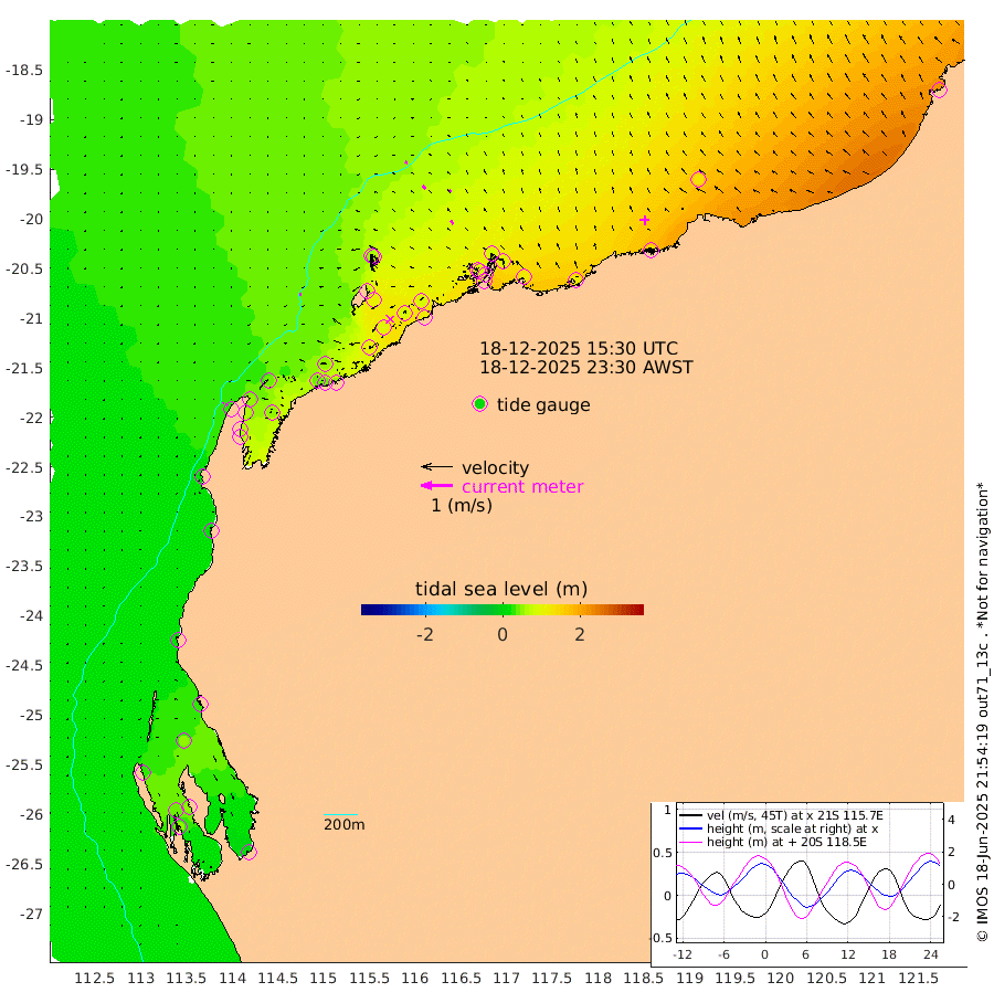6cm/s -100T +12cm/s rms + 5cm/s -173T. NWSBAR 206m 4cm/s -133T +22cm/s rms + 10cm/s -148T. TAN100 109m 8cm/s -76T +11cm/s rms + 8cm/s -129T. PIL200 208m 14cm/s -44T +13cm/s rms + 7cm/s -137T. PIL100 105m 15cm/s -36T +12cm/s rms + 2cm/s -92T. PIL050 55m 5cm/s -129T +18cm/s rms + 4cm/s -149T. NRSNIN 61m 11cm/s -26T +6cm/s rms + 3cm/s 112T. NW Shelf M6 65m 34cm Withnell Point 46cm Denham 44cm Shark Bay (Inr Bn) 47cm Shark Bay 46cm Useless Loop 3cm Hamelin Pool 33cm Carnarvon 18cm Cape Cuvier 20cm Coral Bay 19cm Norwegian Bay 64cm Badjirrajirra 24cm Tantabiddi 46cm Point Murat 56cm Exmouth 64cm Learmonth 49cm Y Island 34cm North Muiron Island 40cm Roller 45cm Ashburton North 51cm Onslow (Beadon Creek) 47cm Thevenard Island 105cm Large Island 97cm North Sandy Island 70cm Barrow Island (Wapet Landing) 102cm Barrow Island (Tanker Mooring) 88cm Withnell Bay 63cm Trimouille Island 54cm North West Island 122cm Fortescue Road 80cm Steamboat Island 81cm Sholl Island 88cm Fairway Beacon 87cm Mawby Island 89cm Dampier (King Bay) 86cm Cape Legendre 99cm Hauy Island 115cm Port Walcott (Cape Lambert) 122cm Depuch Island 139cm Port Hedland 134cm Bedout Island 215cm Lagrange Bay