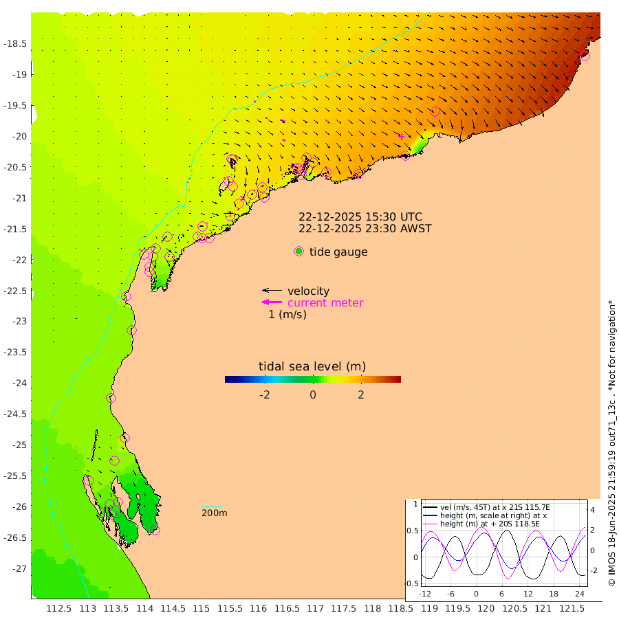3cm/s 35T +12cm/s rms + 5cm/s -173T. NWSBAR 206m 5cm/s 39T +22cm/s rms + 10cm/s -148T. TAN100 109m 8cm/s 107T +11cm/s rms + 8cm/s -129T. PIL200 208m 12cm/s 118T +13cm/s rms + 7cm/s -137T. PIL100 105m 15cm/s 118T +12cm/s rms + 2cm/s -92T. PIL050 55m 5cm/s 42T +18cm/s rms + 4cm/s -149T. NRSNIN 61m 24cm/s 109T +6cm/s rms + 3cm/s 112T. NW Shelf M6 65m 46cm Withnell Point 41cm Denham 38cm Shark Bay (Inr Bn) 46cm Shark Bay 36cm Useless Loop -7cm Hamelin Pool 60cm Carnarvon 52cm Cape Cuvier 56cm Coral Bay 56cm Norwegian Bay 91cm Badjirrajirra 62cm Tantabiddi 76cm Point Murat 85cm Exmouth 86cm Learmonth 90cm Y Island 74cm North Muiron Island 85cm Roller 86cm Ashburton North 90cm Onslow (Beadon Creek) 89cm Thevenard Island 120cm Large Island 127cm North Sandy Island 110cm Barrow Island (Wapet Landing) 126cm Barrow Island (Tanker Mooring) 148cm Withnell Bay 100cm Trimouille Island 97cm North West Island 138cm Fortescue Road 147cm Steamboat Island 116cm Sholl Island 146cm Fairway Beacon 147cm Mawby Island 149cm Dampier (King Bay) 147cm Cape Legendre 152cm Hauy Island 174cm Port Walcott (Cape Lambert) 195cm Depuch Island 210cm Port Hedland 221cm Bedout Island 371cm Lagrange Bay