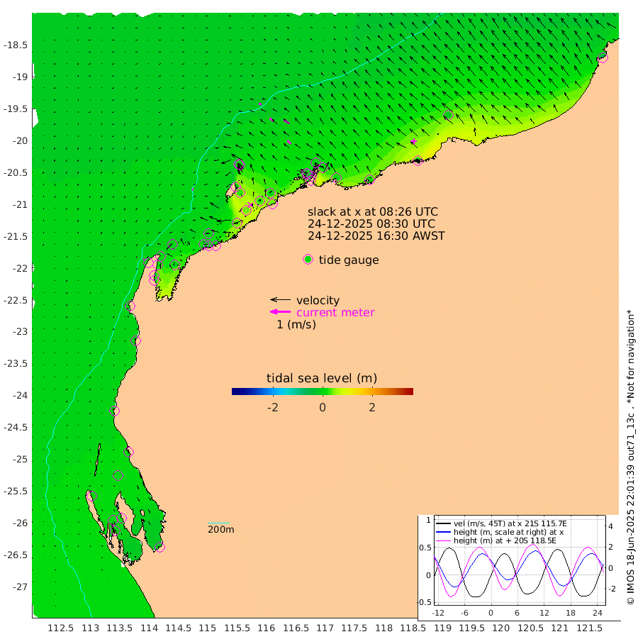 8cm/s -120T +12cm/s rms + 5cm/s -173T. NWSBAR 206m 4cm/s -136T +22cm/s rms + 10cm/s -148T. TAN100 109m 14cm/s -73T +11cm/s rms + 8cm/s -129T. PIL200 208m 21cm/s -53T +13cm/s rms + 7cm/s -137T. PIL100 105m 25cm/s -47T +12cm/s rms + 2cm/s -92T. PIL050 55m 3cm/s -121T +18cm/s rms + 4cm/s -149T. NRSNIN 61m 33cm/s -52T +6cm/s rms + 3cm/s 112T. NW Shelf M6 65m 7cm Withnell Point 9cm Denham 4cm Shark Bay (Inr Bn) 4cm Shark Bay -3cm Useless Loop -13cm Hamelin Pool 11cm Carnarvon -1cm Cape Cuvier -3cm Coral Bay -1cm Norwegian Bay 18cm Badjirrajirra -3cm Tantabiddi 9cm Point Murat 15cm Exmouth 19cm Learmonth 4cm Y Island -1cm North Muiron Island -2cm Roller 1cm Ashburton North 3cm Onslow (Beadon Creek) 0cm Thevenard Island 37cm Large Island 35cm North Sandy Island 10cm Barrow Island (Wapet Landing) 34cm Barrow Island (Tanker Mooring) 2cm Withnell Bay 10cm Trimouille Island -1cm North West Island 39cm Fortescue Road 3cm Steamboat Island 28cm Sholl Island 4cm Fairway Beacon 1cm Mawby Island 2cm Dampier (King Bay) 0cm Cape Legendre 13cm Hauy Island 10cm Port Walcott (Cape Lambert) 17cm Depuch Island 8cm Port Hedland -21cm Bedout Island -68cm Lagrange Bay