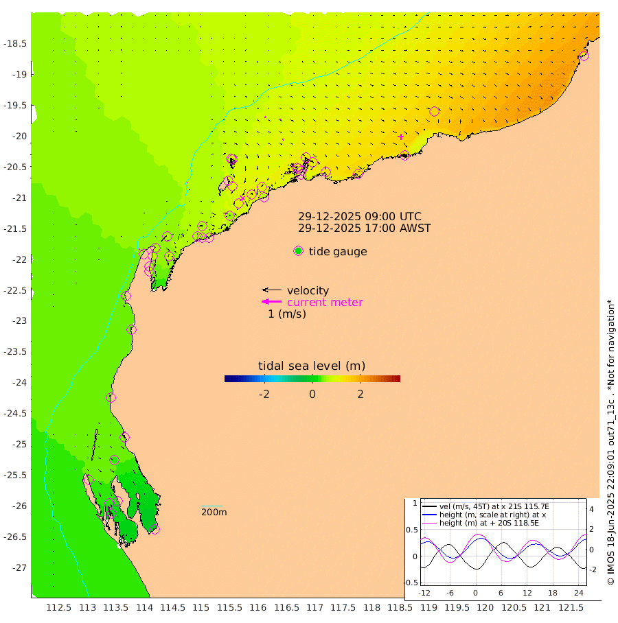 2cm/s -41T +12cm/s rms + 5cm/s -173T. NWSBAR 206m 3cm/s 39T +22cm/s rms + 10cm/s -148T. TAN100 109m 3cm/s 87T +11cm/s rms + 8cm/s -129T. PIL200 208m 6cm/s 96T +13cm/s rms + 7cm/s -137T. PIL100 105m 8cm/s 92T +12cm/s rms + 2cm/s -92T. PIL050 55m 3cm/s 43T +18cm/s rms + 4cm/s -149T. NRSNIN 61m 4cm/s 57T +6cm/s rms + 3cm/s 112T. NW Shelf M6 65m 35cm Withnell Point 26cm Denham 25cm Shark Bay (Inr Bn) 25cm Shark Bay 17cm Useless Loop -13cm Hamelin Pool 51cm Carnarvon 42cm Cape Cuvier 44cm Coral Bay 49cm Norwegian Bay 76cm Badjirrajirra 48cm Tantabiddi 61cm Point Murat 69cm Exmouth 71cm Learmonth 69cm Y Island 56cm North Muiron Island 61cm Roller 65cm Ashburton North 70cm Onslow (Beadon Creek) 67cm Thevenard Island 55cm Large Island 97cm North Sandy Island 84cm Barrow Island (Wapet Landing) 96cm Barrow Island (Tanker Mooring) 110cm Withnell Bay 85cm Trimouille Island 65cm North West Island 62cm Fortescue Road 108cm Steamboat Island 104cm Sholl Island 107cm Fairway Beacon 107cm Mawby Island 108cm Dampier (King Bay) 118cm Cape Legendre 111cm Hauy Island 127cm Port Walcott (Cape Lambert) 133cm Depuch Island 150cm Port Hedland 142cm Bedout Island 110cm Lagrange Bay