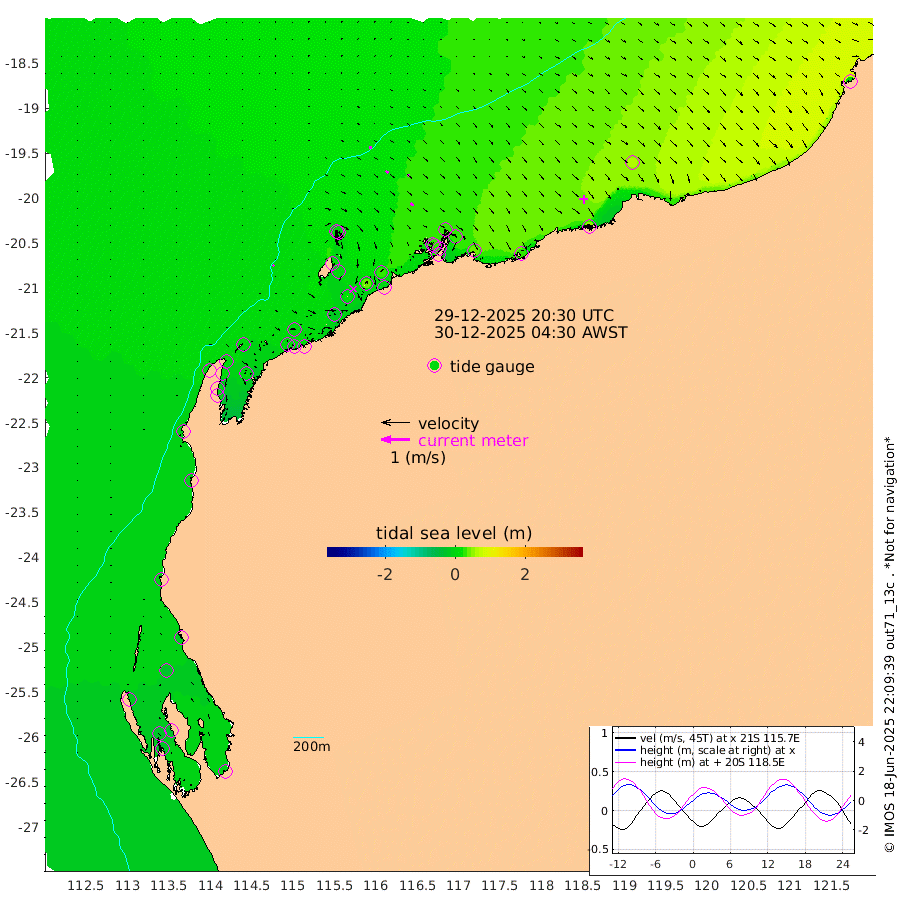 6cm/s 41T +12cm/s rms + 5cm/s -173T. NWSBAR 206m 1cm/s 67T +22cm/s rms + 10cm/s -148T. TAN100 109m 9cm/s 104T +11cm/s rms + 8cm/s -129T. PIL200 208m 11cm/s 129T +13cm/s rms + 7cm/s -137T. PIL100 105m 12cm/s 133T +12cm/s rms + 2cm/s -92T. PIL050 55m 1cm/s 64T +18cm/s rms + 4cm/s -149T. NRSNIN 61m 5cm/s 128T +6cm/s rms + 3cm/s 112T. NW Shelf M6 65m -21cm Withnell Point -30cm Denham -28cm Shark Bay (Inr Bn) -26cm Shark Bay -29cm Useless Loop 0cm Hamelin Pool -13cm Carnarvon -6cm Cape Cuvier -5cm Coral Bay -3cm Norwegian Bay 5cm Badjirrajirra -2cm Tantabiddi 0cm Point Murat 2cm Exmouth 4cm Learmonth 6cm Y Island 0cm North Muiron Island 4cm Roller 6cm Ashburton North 7cm Onslow (Beadon Creek) 7cm Thevenard Island -17cm Large Island 13cm North Sandy Island 14cm Barrow Island (Wapet Landing) 11cm Barrow Island (Tanker Mooring) 32cm Withnell Bay 6cm Trimouille Island 8cm North West Island -9cm Fortescue Road 26cm Steamboat Island 42cm Sholl Island 30cm Fairway Beacon 33cm Mawby Island 31cm Dampier (King Bay) 32cm Cape Legendre 33cm Hauy Island 40cm Port Walcott (Cape Lambert) 27cm Depuch Island 56cm Port Hedland 67cm Bedout Island 9cm Lagrange Bay