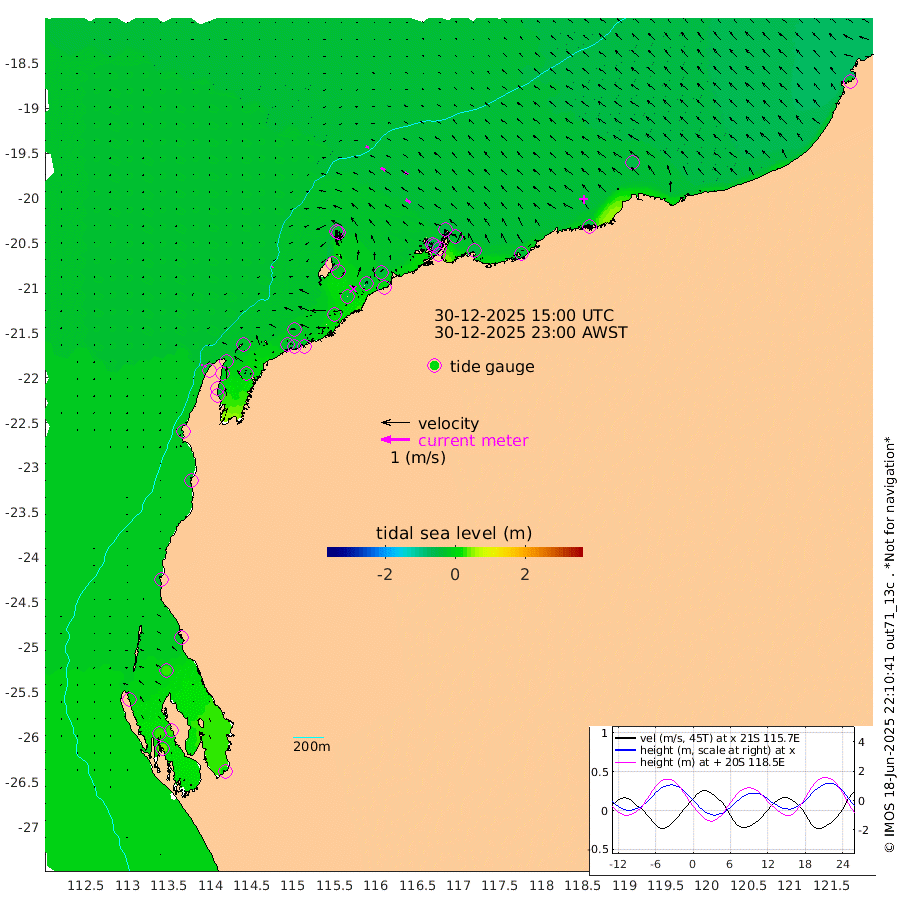 5cm/s -136T +12cm/s rms + 5cm/s -173T. NWSBAR 206m 6cm/s -134T +22cm/s rms + 10cm/s -148T. TAN100 109m 11cm/s -78T +11cm/s rms + 8cm/s -129T. PIL200 208m 18cm/s -58T +13cm/s rms + 7cm/s -137T. PIL100 105m 20cm/s -53T +12cm/s rms + 2cm/s -92T. PIL050 55m 7cm/s -132T +18cm/s rms + 4cm/s -149T. NRSNIN 61m 14cm/s -55T +6cm/s rms + 3cm/s 112T. NW Shelf M6 65m 2cm Withnell Point 26cm Denham 26cm Shark Bay (Inr Bn) 27cm Shark Bay 36cm Useless Loop 17cm Hamelin Pool -15cm Carnarvon -23cm Cape Cuvier -23cm Coral Bay -26cm Norwegian Bay -23cm Badjirrajirra -24cm Tantabiddi -21cm Point Murat -20cm Exmouth -26cm Learmonth -24cm Y Island -24cm North Muiron Island -27cm Roller -29cm Ashburton North -28cm Onslow (Beadon Creek) -29cm Thevenard Island 4cm Large Island -28cm North Sandy Island -32cm Barrow Island (Wapet Landing) -21cm Barrow Island (Tanker Mooring) -48cm Withnell Bay -31cm Trimouille Island -29cm North West Island 8cm Fortescue Road -44cm Steamboat Island -49cm Sholl Island -45cm Fairway Beacon -51cm Mawby Island -47cm Dampier (King Bay) -55cm Cape Legendre -43cm Hauy Island -50cm Port Walcott (Cape Lambert) -41cm Depuch Island -61cm Port Hedland -51cm Bedout Island -14cm Lagrange Bay