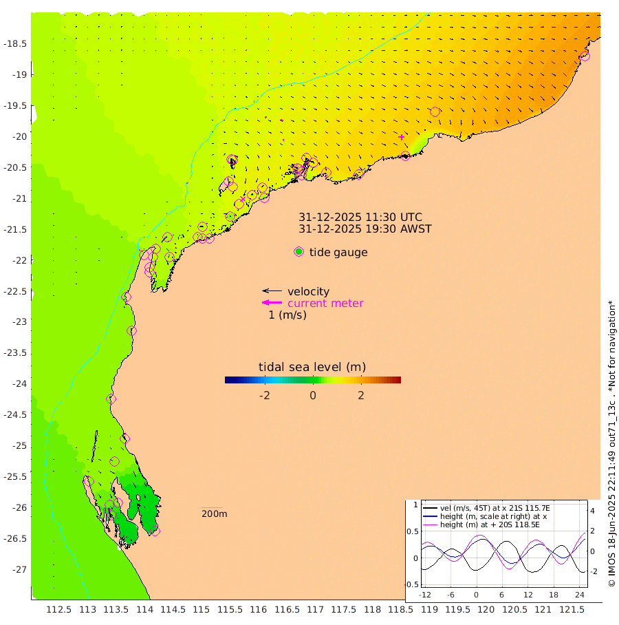 2cm/s -48T +12cm/s rms + 5cm/s -173T. NWSBAR 206m 3cm/s 40T +22cm/s rms + 10cm/s -148T. TAN100 109m 2cm/s 95T +11cm/s rms + 8cm/s -129T. PIL200 208m 6cm/s 93T +13cm/s rms + 7cm/s -137T. PIL100 105m 8cm/s 94T +12cm/s rms + 2cm/s -92T. PIL050 55m 3cm/s 38T +18cm/s rms + 4cm/s -149T. NRSNIN 61m 11cm/s 100T +6cm/s rms + 3cm/s 112T. NW Shelf M6 65m 50cm Withnell Point 47cm Denham 43cm Shark Bay (Inr Bn) 48cm Shark Bay 40cm Useless Loop -9cm Hamelin Pool 63cm Carnarvon 51cm Cape Cuvier 53cm Coral Bay 56cm Norwegian Bay 85cm Badjirrajirra 56cm Tantabiddi 70cm Point Murat 78cm Exmouth 78cm Learmonth 78cm Y Island 65cm North Muiron Island 72cm Roller 75cm Ashburton North 79cm Onslow (Beadon Creek) 77cm Thevenard Island 54cm Large Island 103cm North Sandy Island 93cm Barrow Island (Wapet Landing) 106cm Barrow Island (Tanker Mooring) 118cm Withnell Bay 86cm Trimouille Island 78cm North West Island 67cm Fortescue Road 116cm Steamboat Island 97cm Sholl Island 115cm Fairway Beacon 116cm Mawby Island 117cm Dampier (King Bay) 129cm Cape Legendre 119cm Hauy Island 135cm Port Walcott (Cape Lambert) 141cm Depuch Island 157cm Port Hedland 152cm Bedout Island 160cm Lagrange Bay